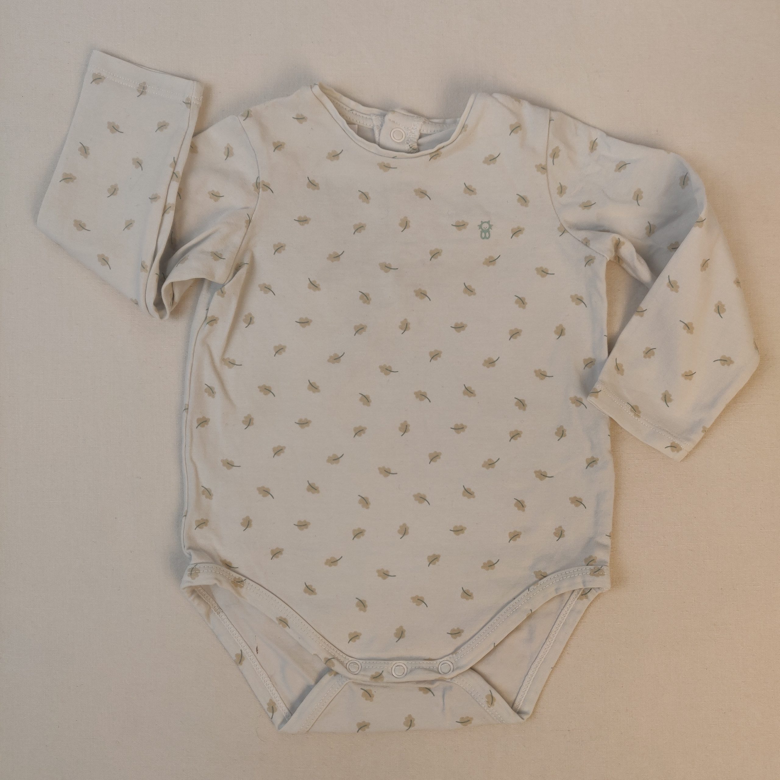 - Body blanc manches longues parsemé de petites feuilles beiges à tige verte, fermeture par boutons pression en haut du dos et à l’entrejambe.
