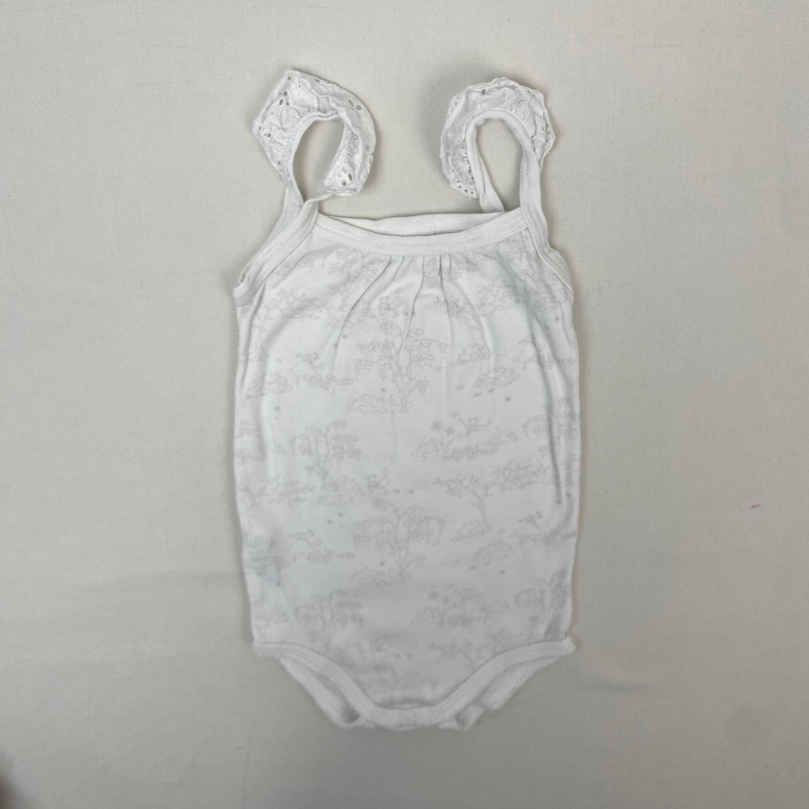 Autres commentaires : Body blanc à bretelles à dentelles, avec des motifs d’arbres, tache au niveau de l’aisselle gauche.