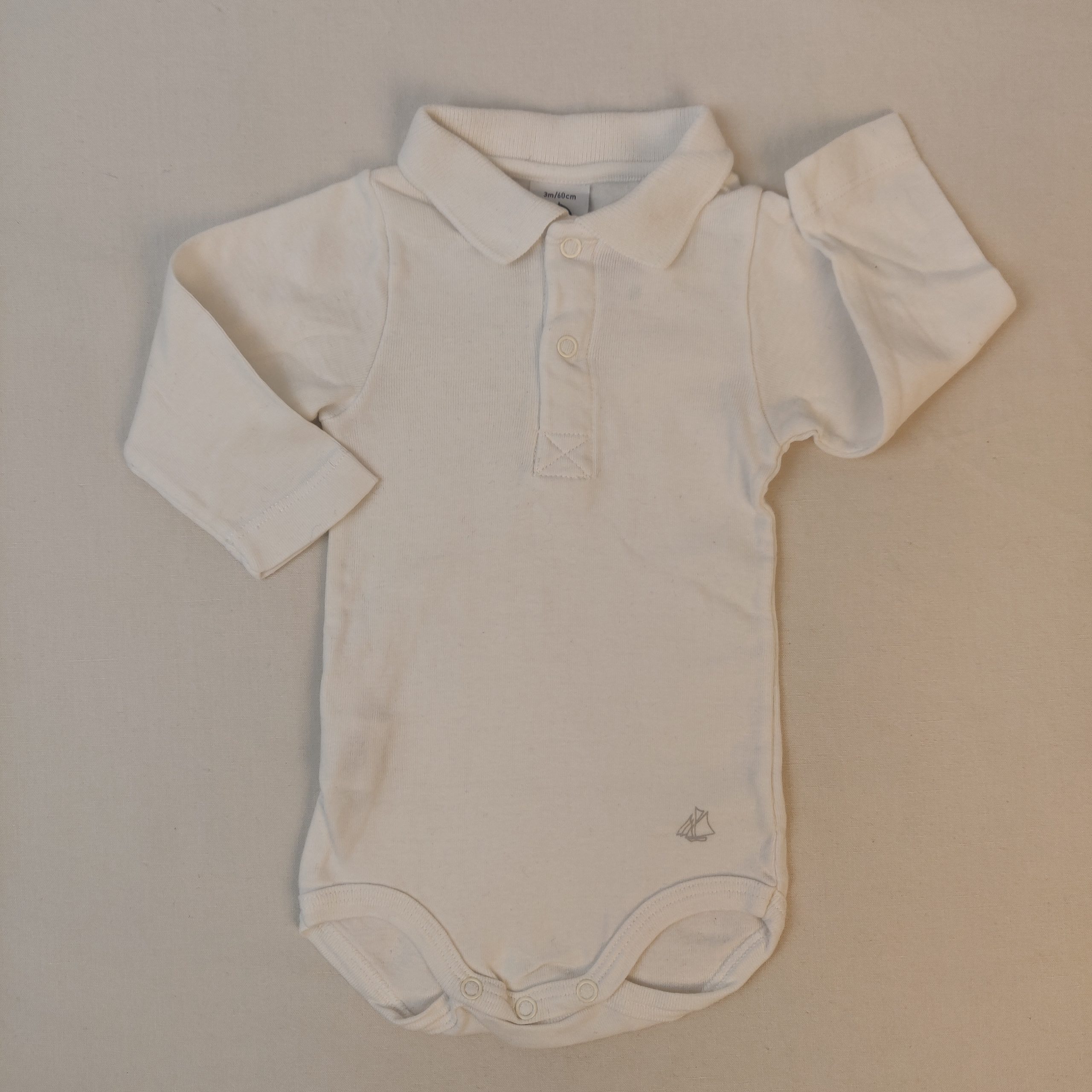 - Body blanc manches longues, col polo fermé par deux boutons pression.