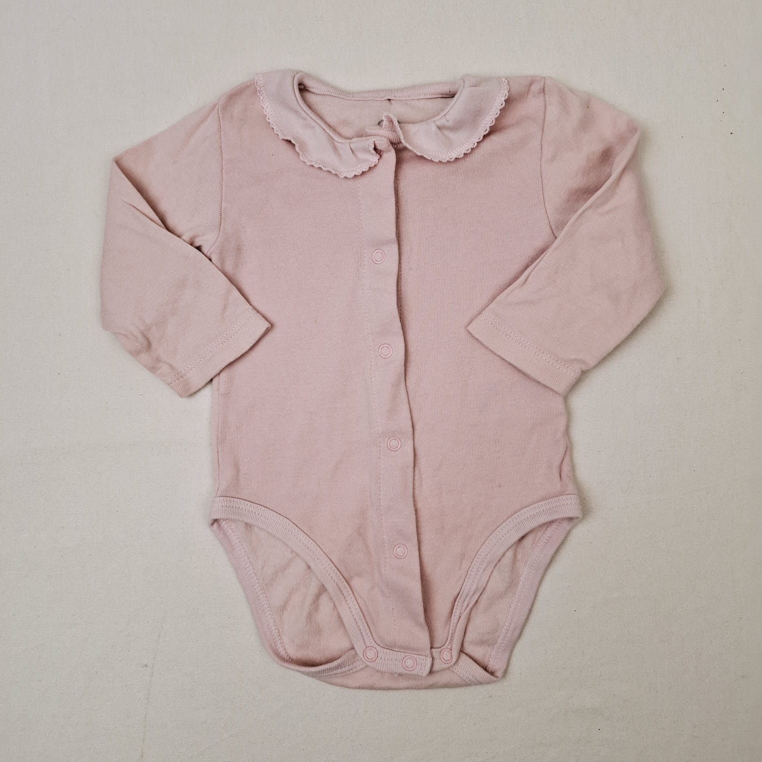 Autres commentaires : Body rose clair à manches longues, col Claudine, fermeture pae boutons pression devant.