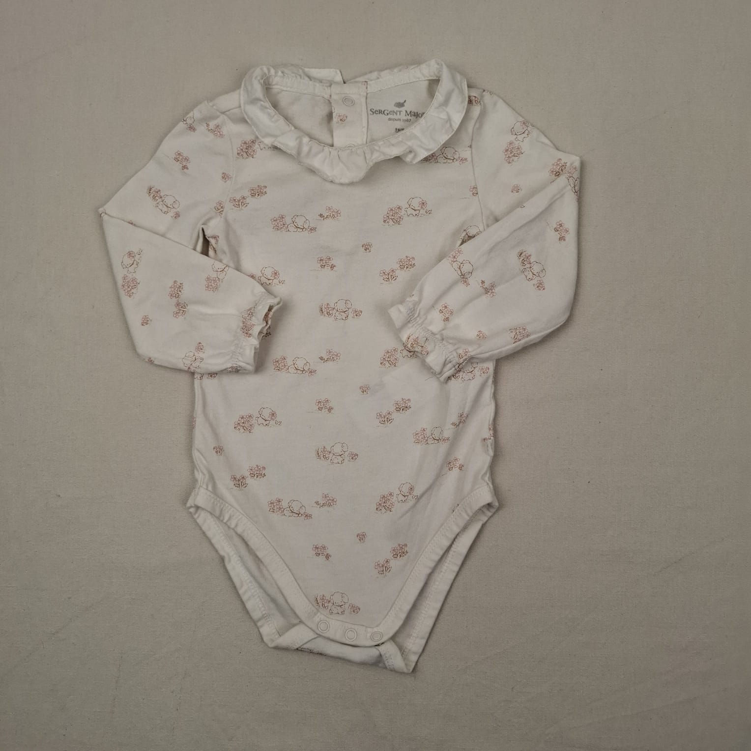 Autres commentaires : Body blanc à manches longues, motif chien et fleur, col collerette blanc uni, fermeture par boutons pression ou dos.