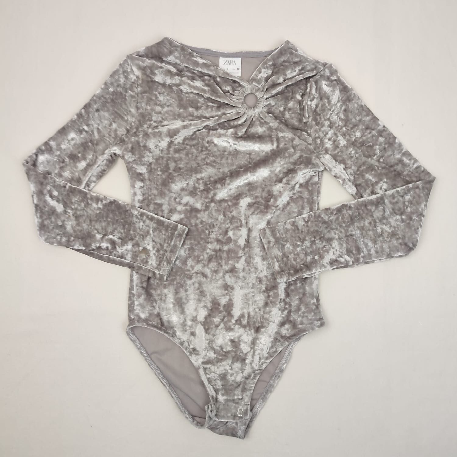 Autres commentaires : Body manches longues en velours gris moiré et brillant, ouverture décorative devant