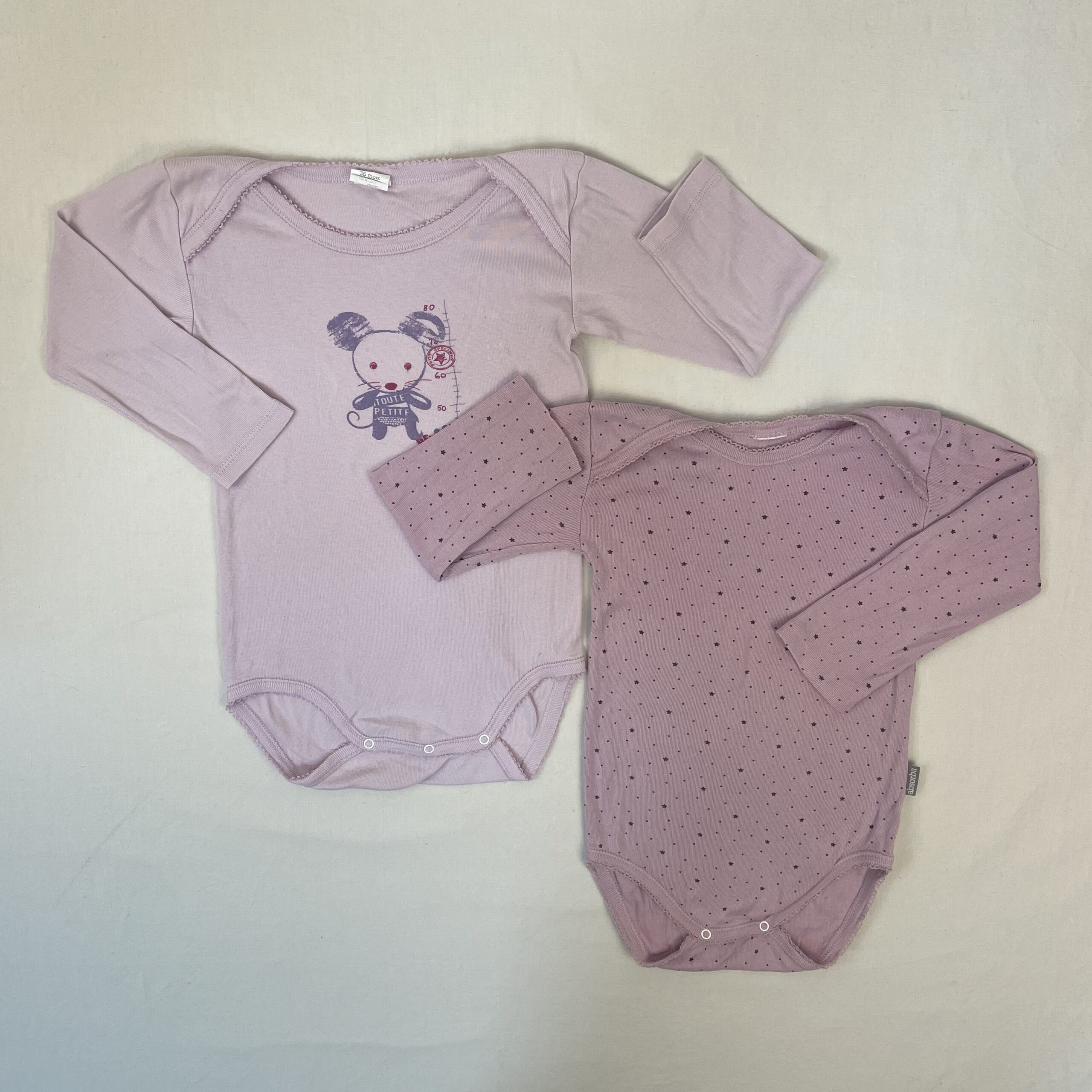- Lot de 2 bodies manches longues mauves, liseré dentelé : – 1 parsemé de mini étoiles violettes. – 1 avec, devant, motif de souris violette avec toise.