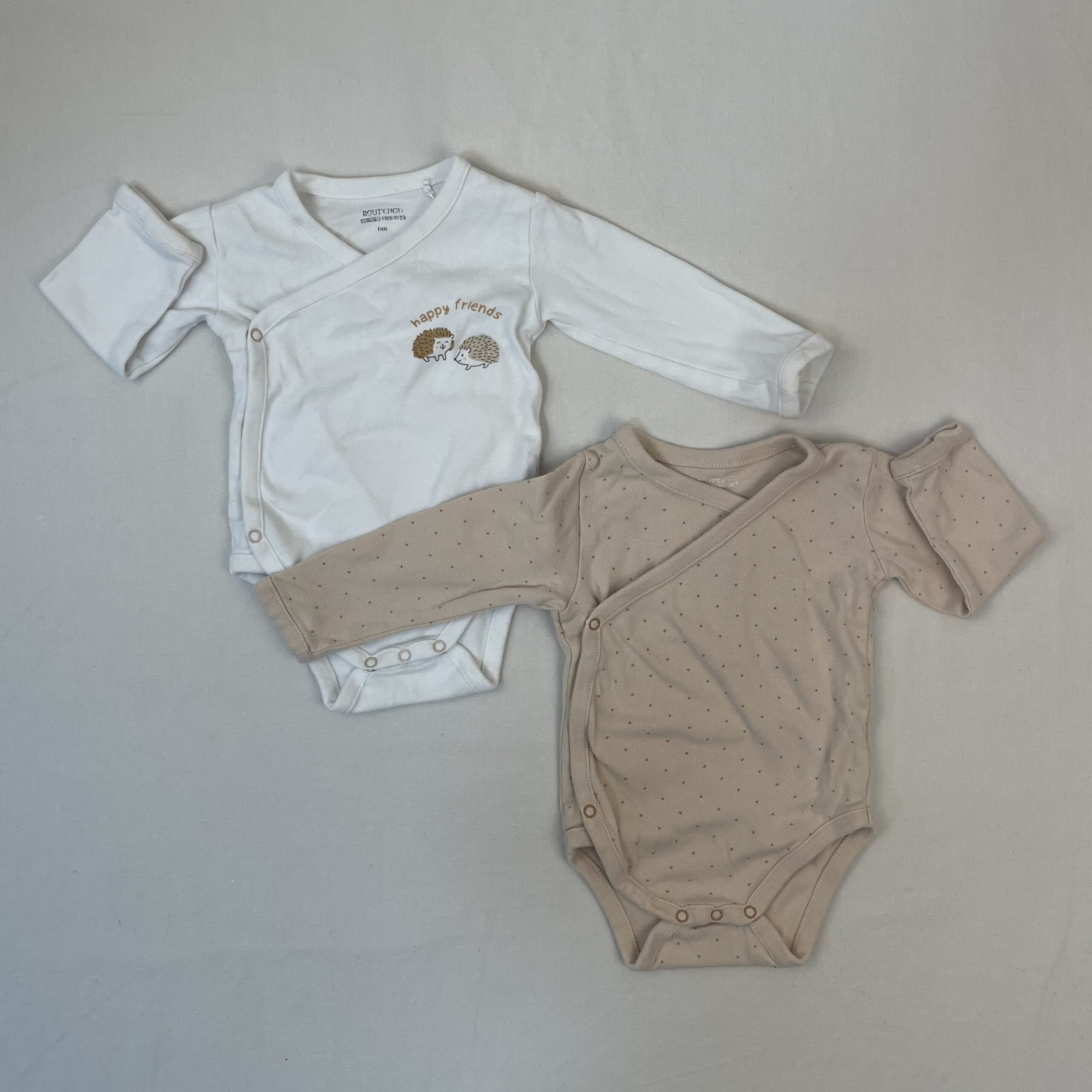 - 2 bodies manches longues, blanc avec motif hérissons avant gauche et beige parsemé des coeurs bruns, fermeture par boutons pression de côté et au bas.