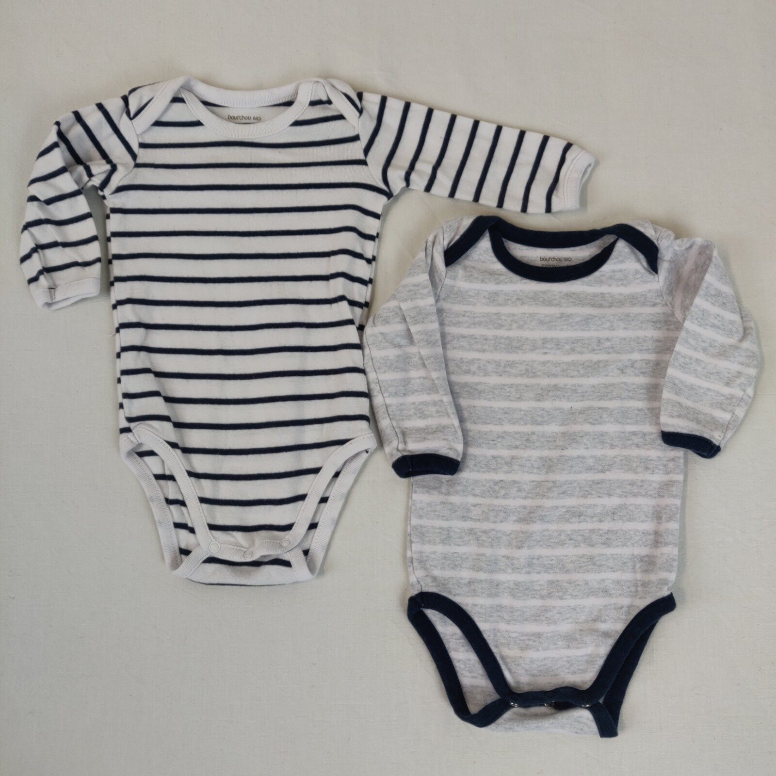 Autres commentaires : Coton biologique – Lot de 2 bodies à manches longues. Un body gris chiné rayé blanc. Col et poignets bleu marine. Un body blanc rayé bleu marine. Usure normale du vêtement.