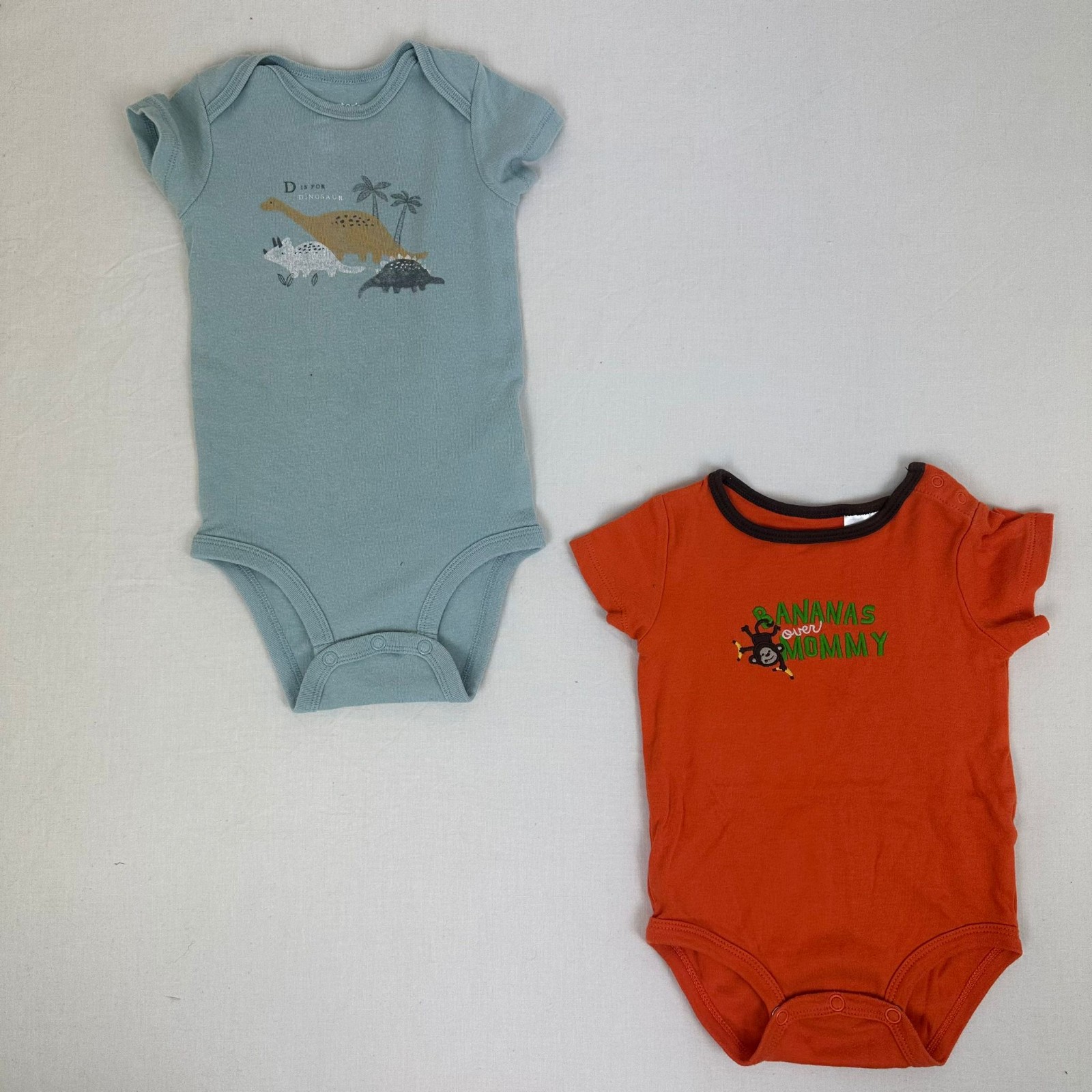 Autres commentaires : 2 bodies manches courtes orange et bleu avec motif d’animal.