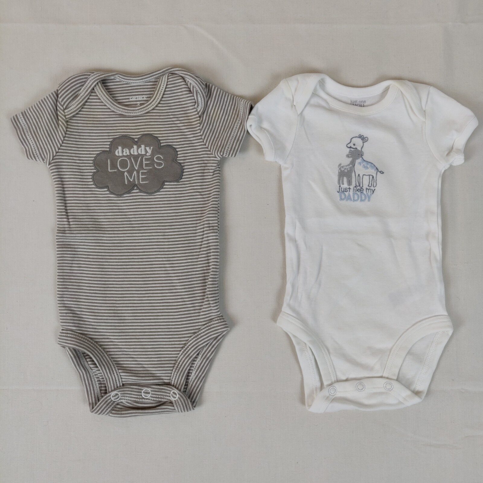 Autres commentaires : Body manches courtes – écru à motifs centraux girafes et inscription « Just like my daddy »- ouverture entre-jambe à 3 boutons pression. Body manches courtes – rayé écru et marron glacé avec motif nuage incluant l’inscription « daddy loves me » – ouverture entre-jambe à 3 boutons pression.