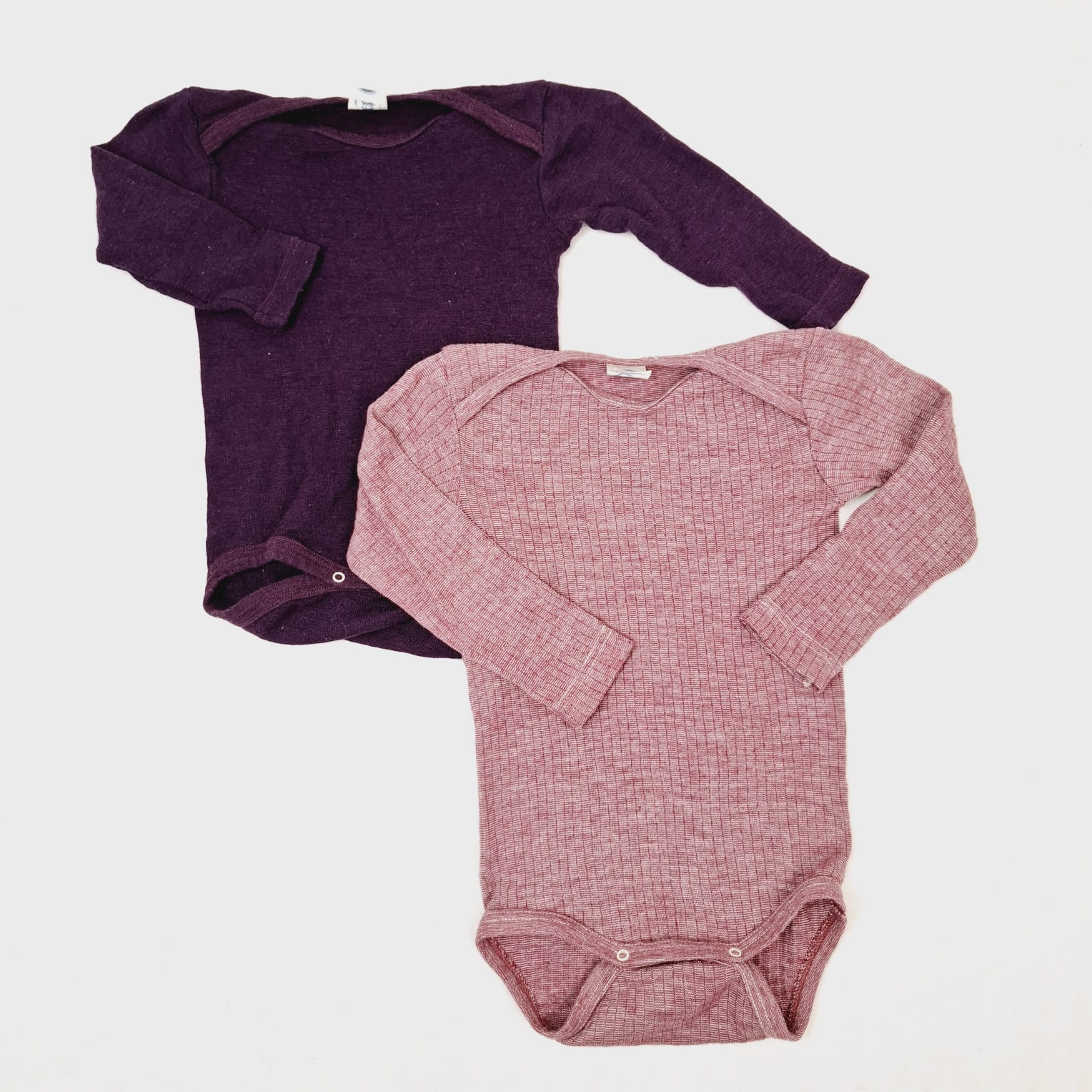 Autres commentaires : Lot de 2 bodies à manches longues, 70% laine et 30% soie pour le violet, 65% coton et 35% laine pour le rose, fermeture par boutons pression.