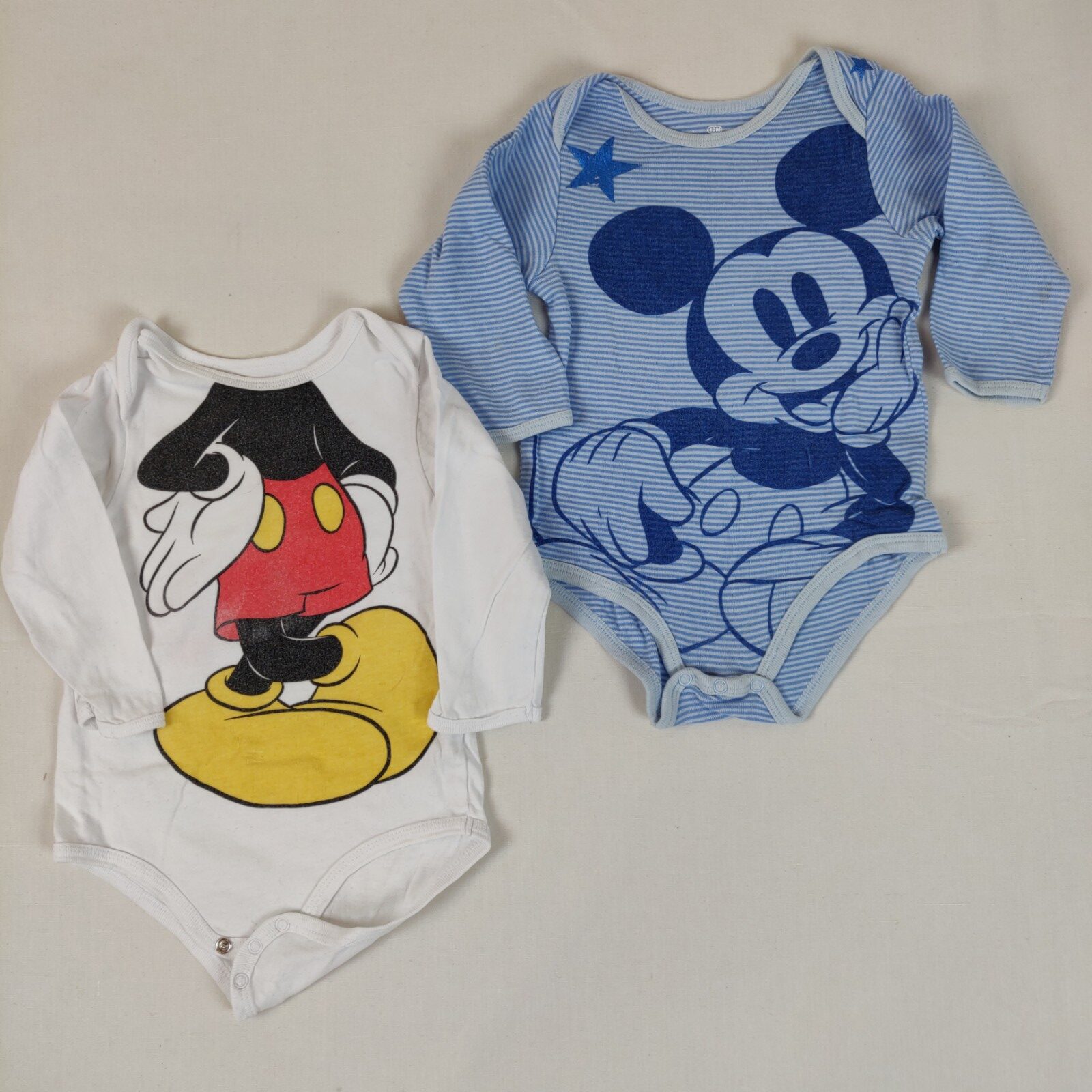 Autres commentaires : Lot de 2 bodies à manches longues. Un body blanc avec le corps de Mickey, le visage de l’enfant faisant office de visage de Mickey. Léger accro près d’une pression. Un body rayé bleu et écru avec motif central Mickey.