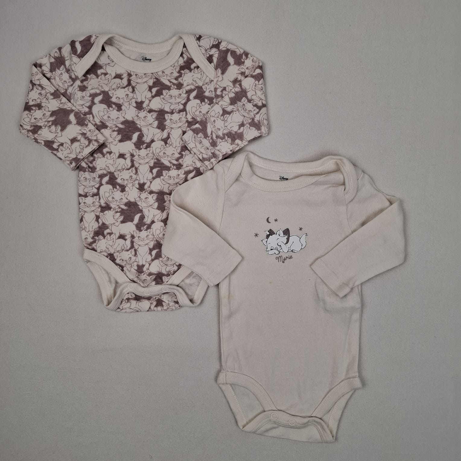 Autres commentaires : Lot de 2 bodys à manches longues, fermeture par 3 boutons à l’entrejambe, finition bords-côtes, col US: -Blanc avec motif chat à l’avant. -Violet pastel à motif chats blanc.