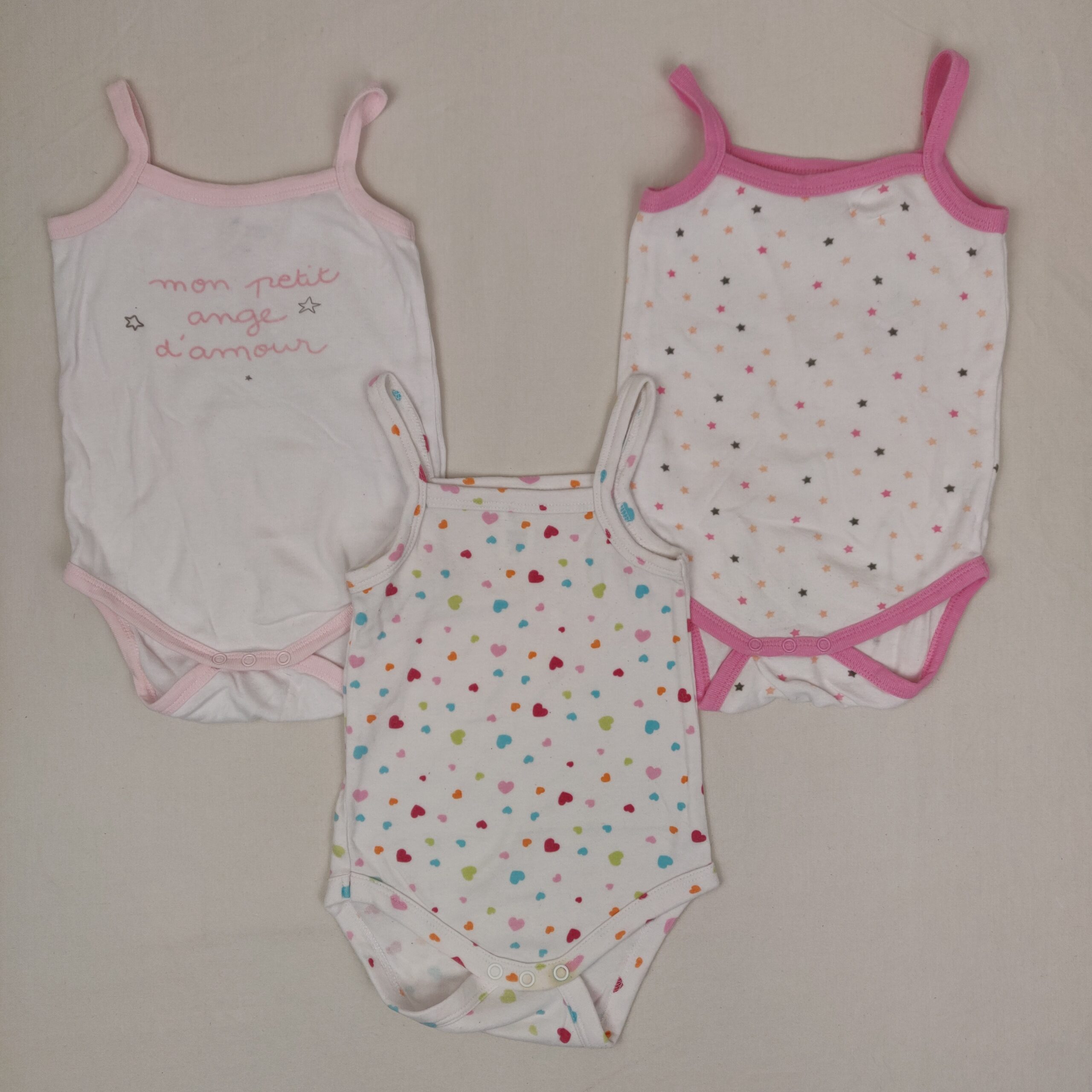 Autres commentaires : Lot de 2 bodies blancs Gemo à bretelles : – un à bordures rose clair, inscription devant « mon petit ange d’amour ». – un à bordures rose vif, parsemé de mini étoiles grises, beige rosé et rose vif. OFFERT : 1 body blanc à bretells Baby Club, parsemé de petits coeurs colorés. Petit défaut trace jaune à lentrejambe