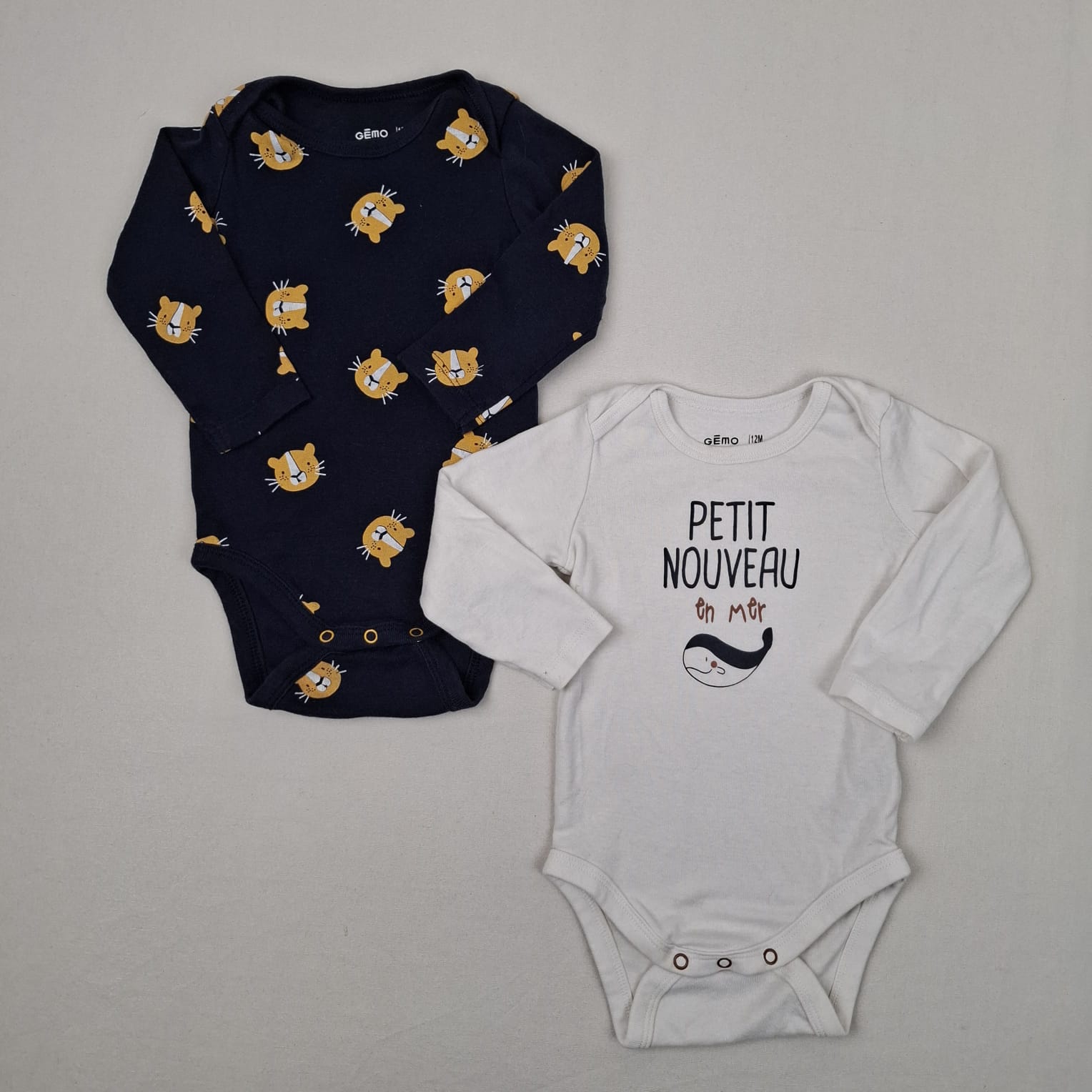 Autres commentaires : Lot de 2 bodies manches longues GEMO avec fermeture boutons pressions en bas , un blanc avec motif baleine et un bleu marine motifs tête de tigre