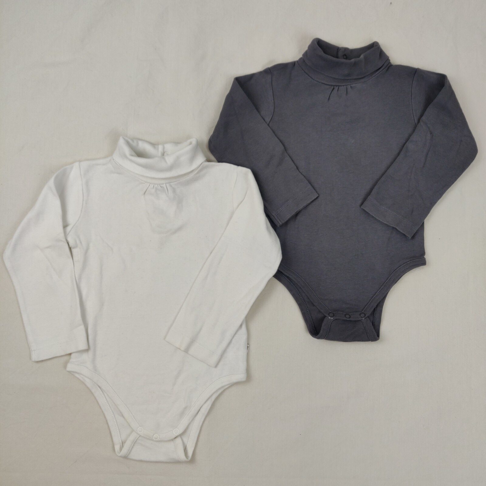 Autres commentaires : 2 bodies manches longues col roulé un blanc et l’autre gris avec une fermeture au dos par boutons pressions.