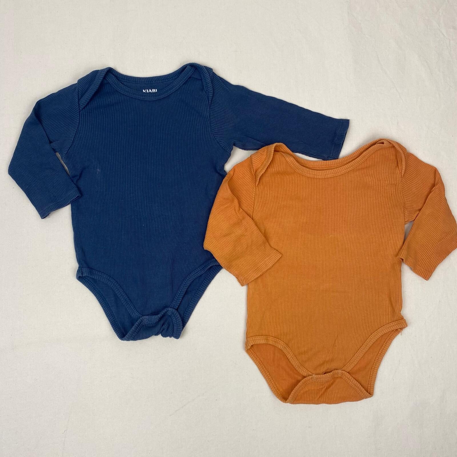Autres commentaires : Lot de 2 bodies manches longues en coton oraganique côtelé : – un bleu acier. – un orange pêche.