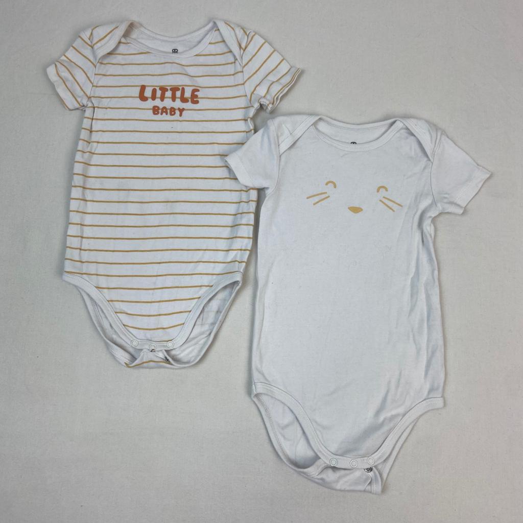 Autres commentaires : Lot de 2 bodies à manches courtes blancs dont 1 à rayures ocre, inscription » Little baby » à l’avant. Body blanc motif tête de chat ocre à l’avant.