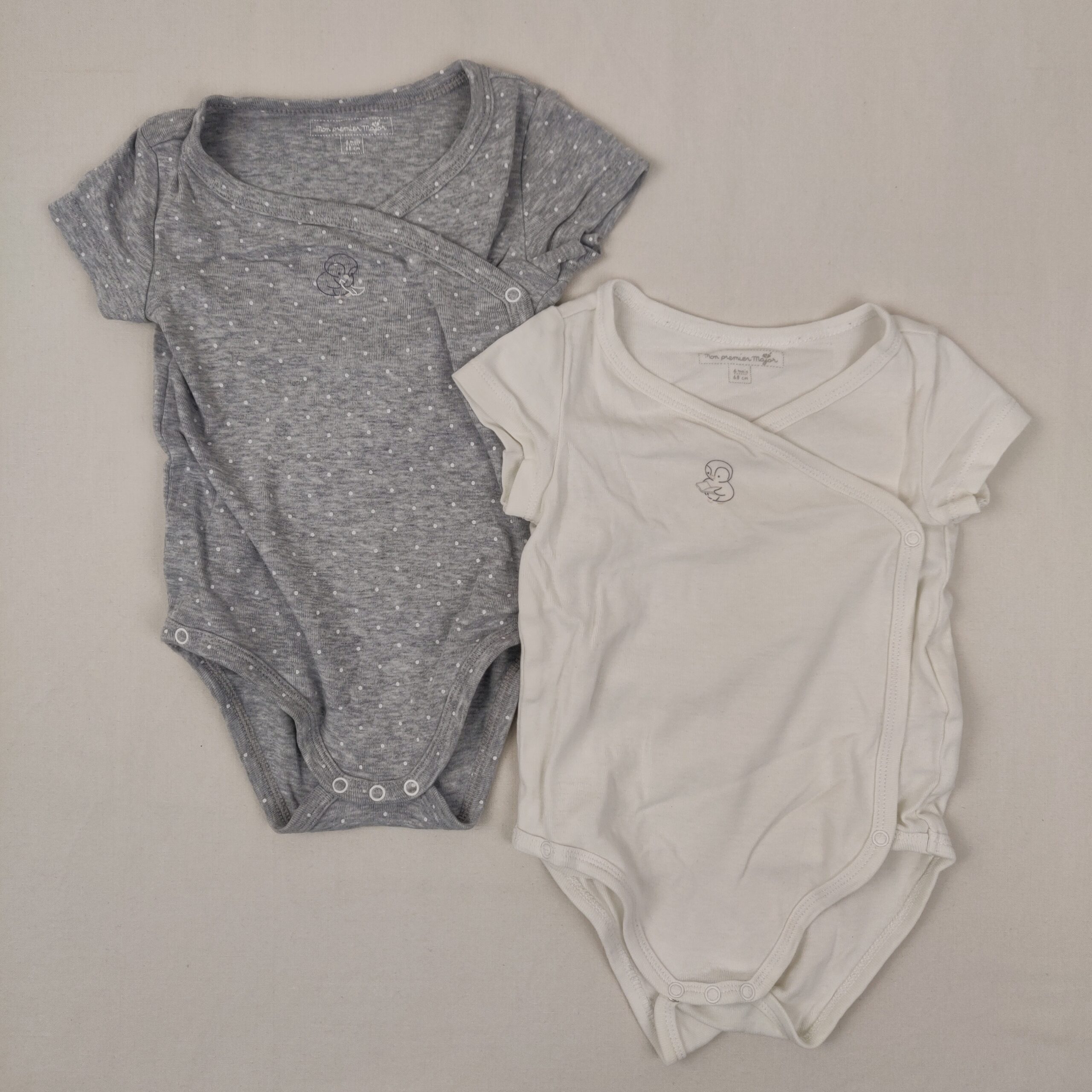 - 2 bodies manches courtes, col cache coeur, fermeture par boutons pression devant gauche et au bas, couleur blanche et grise à pois blancs.