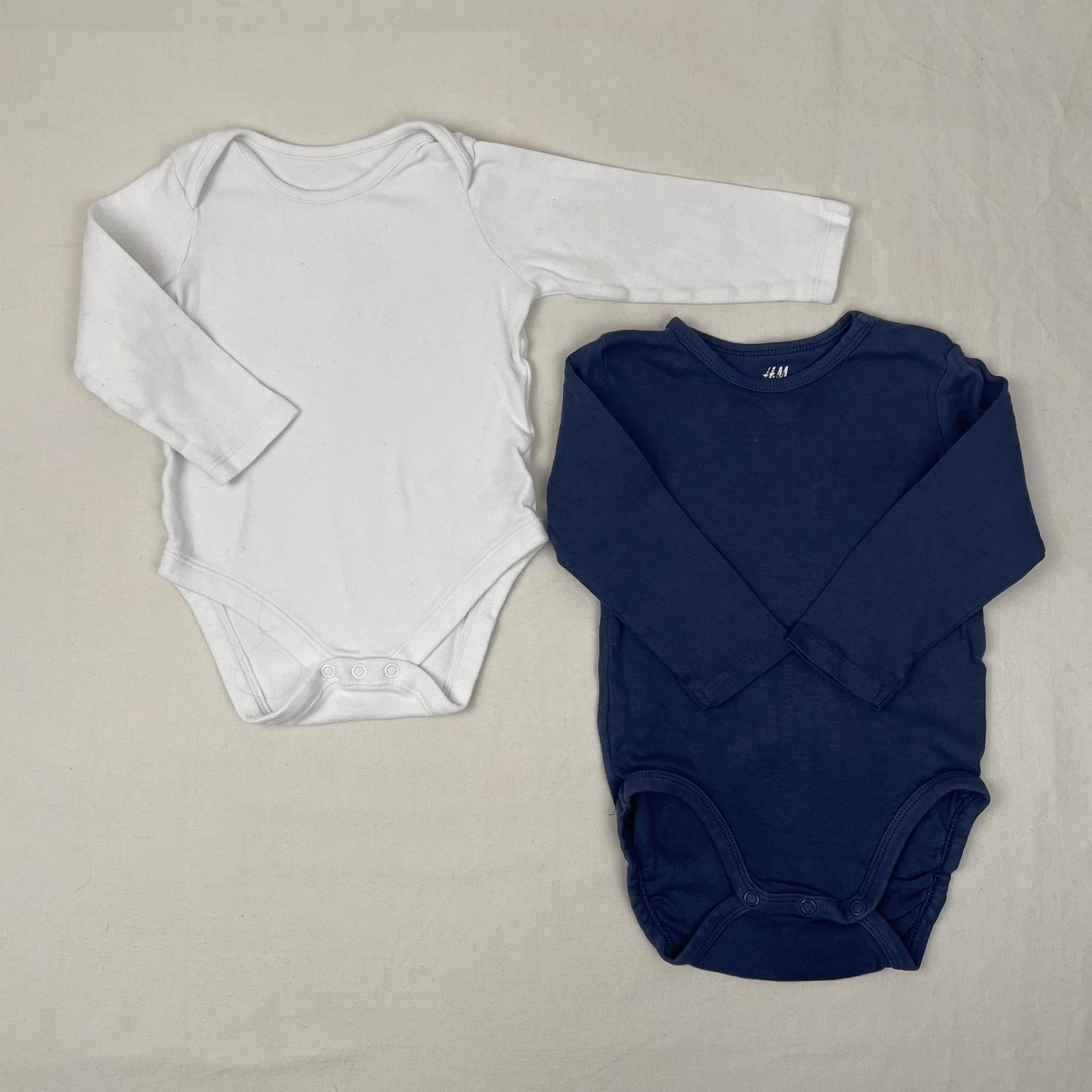 Autres commentaires : Lot de 2 bodies manches longues : – un bleu foncé H&M, fermeture par boutons pression à l’épaule, 100% coton organique. Taille 12M équivalent 18M en Fr. – un blanc sans marque.