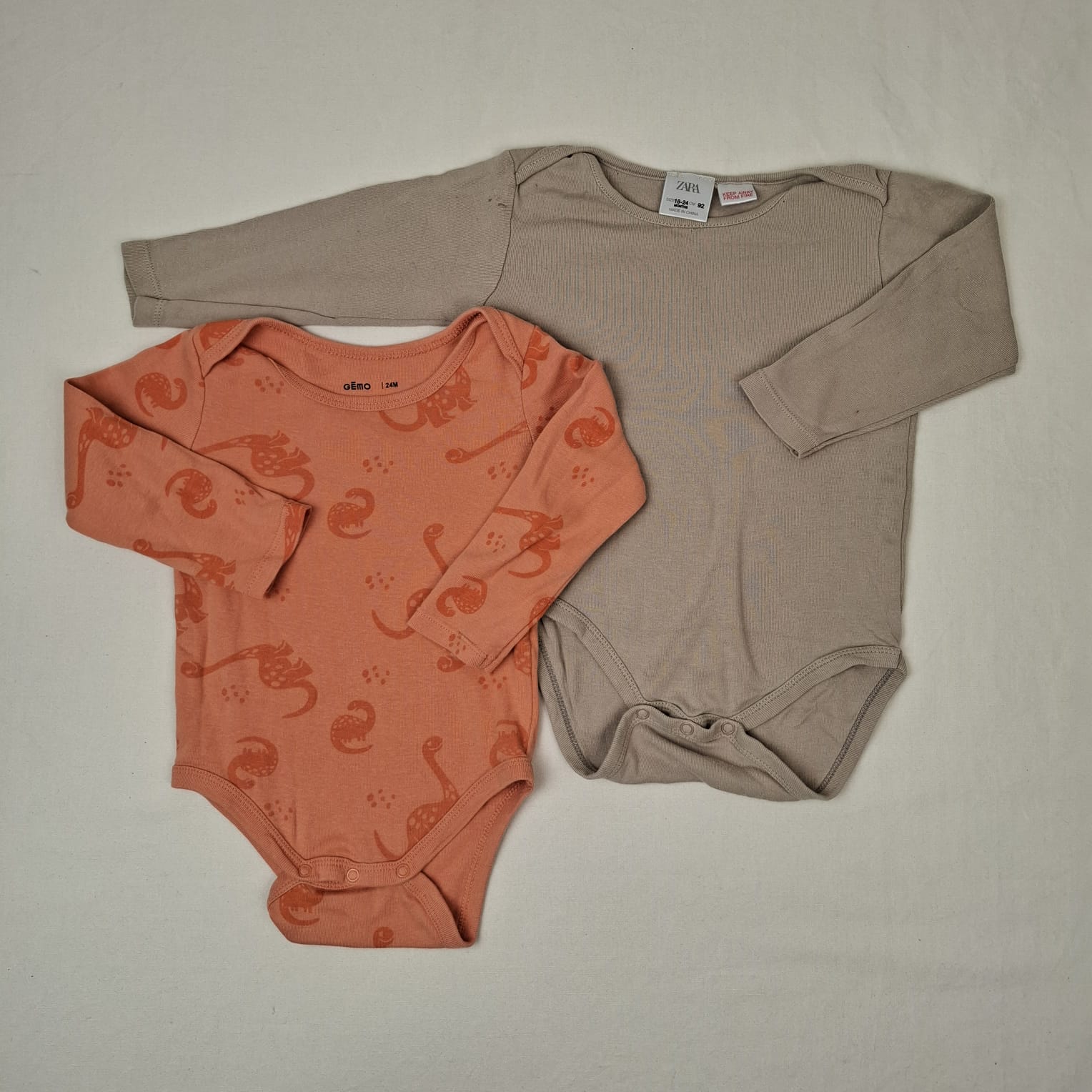 Autres commentaires : Lot de 2 bodies, col US: -Coral GEMO à manches longues,motif dinosaures. -Beige ZARA uni, 100% coton, petite tache devant.