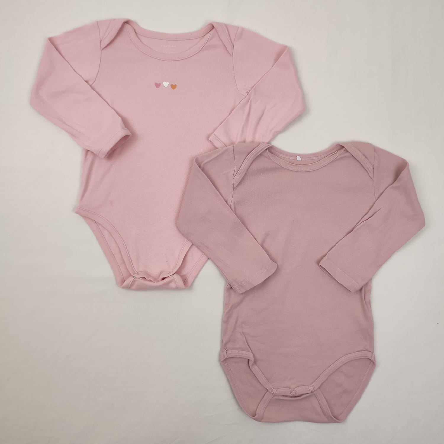 Autres commentaires : Lot de 2 bodies roses à manches longues: – un uni NAMEIT. – un BOUT’CHOU, motifs 3 coeurs