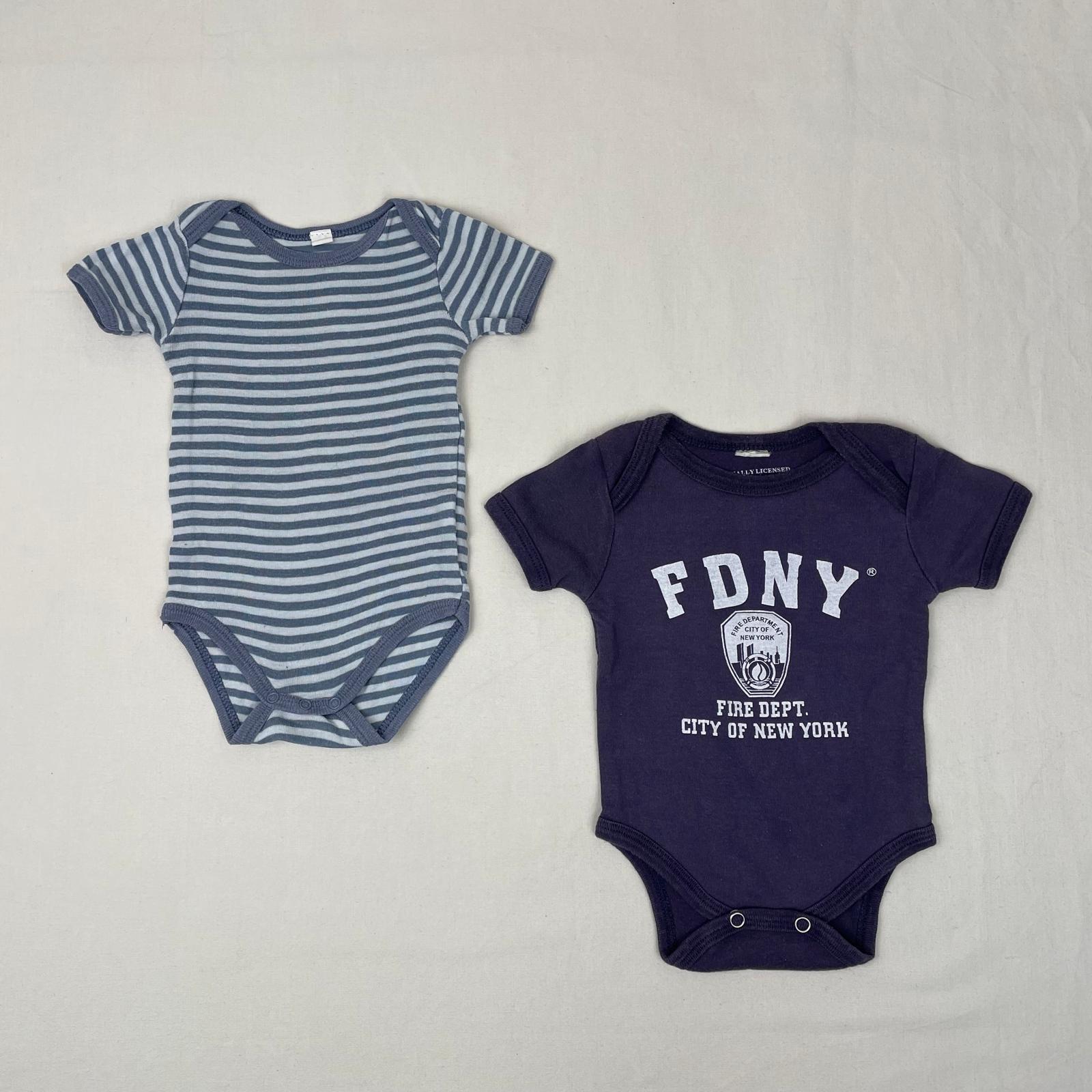 Autres commentaires : Lot de 2 bodies manches courtes : – un violet indigo FDNY, devant emblème et inscription en blanc « Fire Dept. City of New-york ». – un à rayures bleu polaire et bleu pâle Auchan, 100% coton.