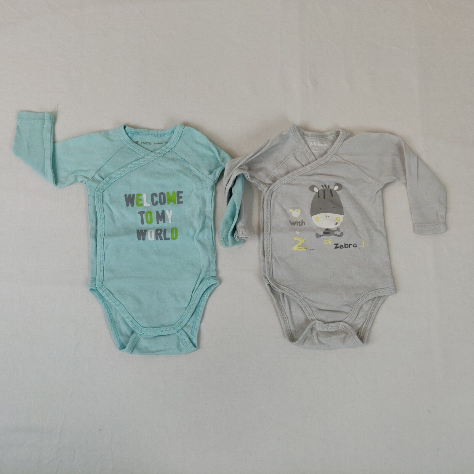 Autres commentaires : Body gris manches longues croisé Kitchoun. Body bleu clair manches longues croisé Gémo « Welcome to my World », petite tâche au dos du poignet gauche