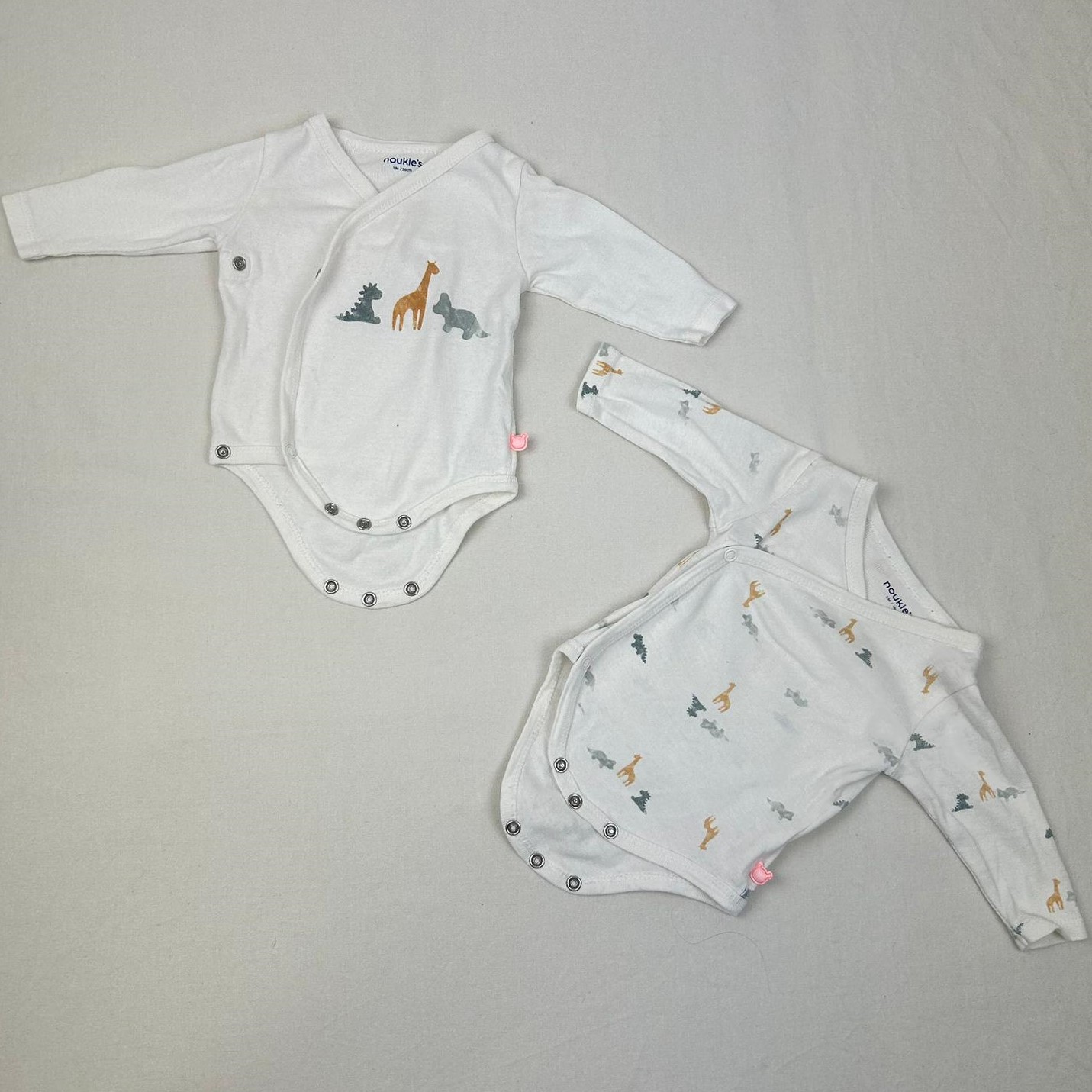 Autres commentaires : Lot de 2 bodies Nookies, manches longues avec des dessins d’animaux, fermeture par boutons pression. Petit défaut : taches à l’arrière d’un des bodies. Niveau réduit de Fraise à Myrtille.