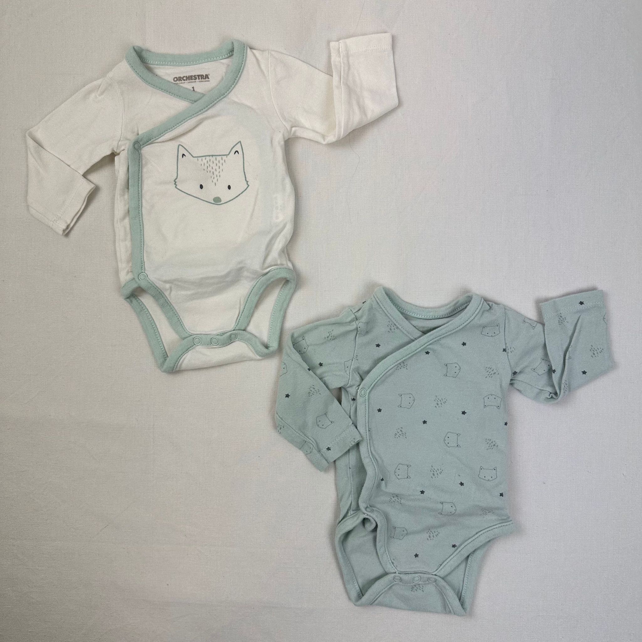 Autres commentaires : 2 bodies manches longues bleu et blanc avec col V.
