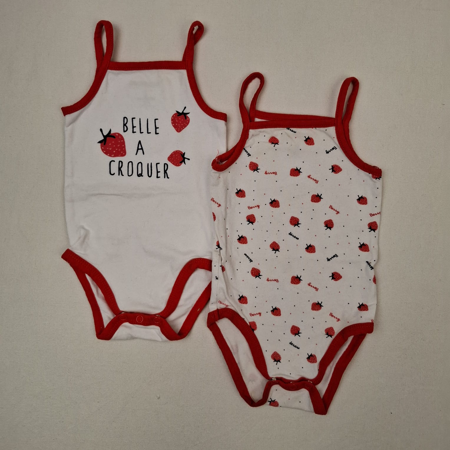 Autres commentaires : Lot de 2 bodies blancs à bretelles et bordures rouges : un body, imprimé mini fraises et inscritpions « straw » et « berry » en rouge et bleu foncé et un body avec devant un motif central de fraises avec inscription « Belle à croquer ».