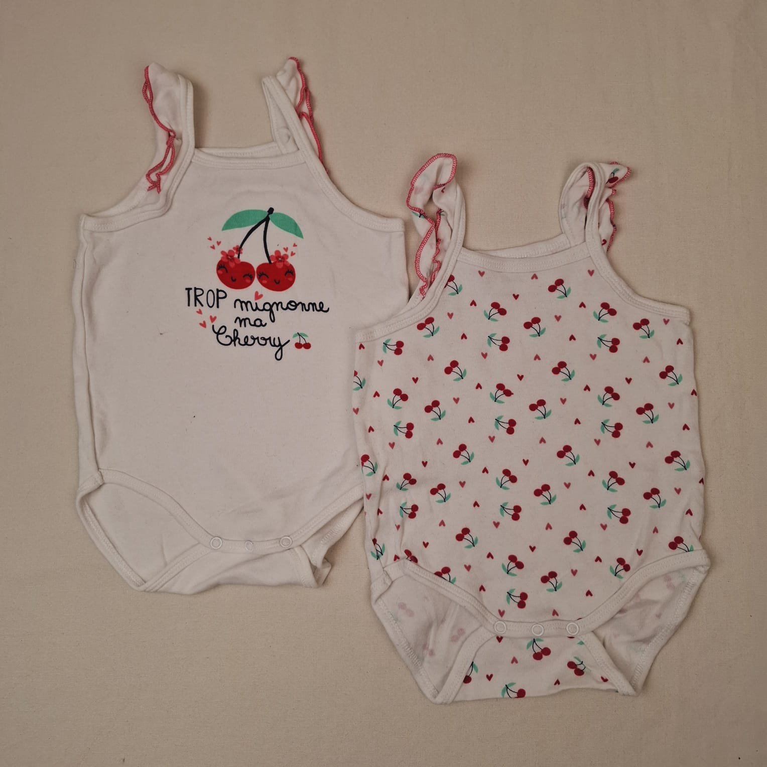 Autres commentaires : Lot de 2 bodys à bretelles volantées: -Blanc uni, motif cerise et inscription « TROP mignonne ma Cherry ». -Blanc à motif cerises.