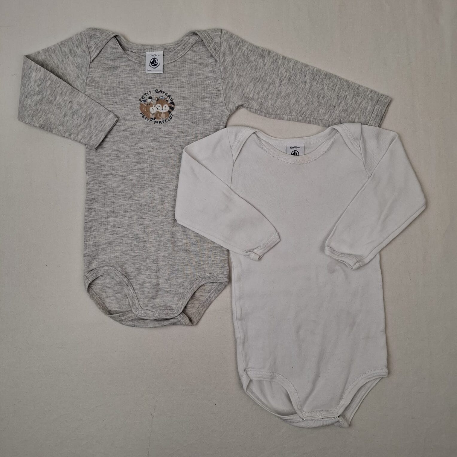 Autres commentaires : Lot de 2 bodys à manches longues, col US: -Blanc. -Gris avec motif raton laveur et inscription « Petit bateau, petit matelot ».