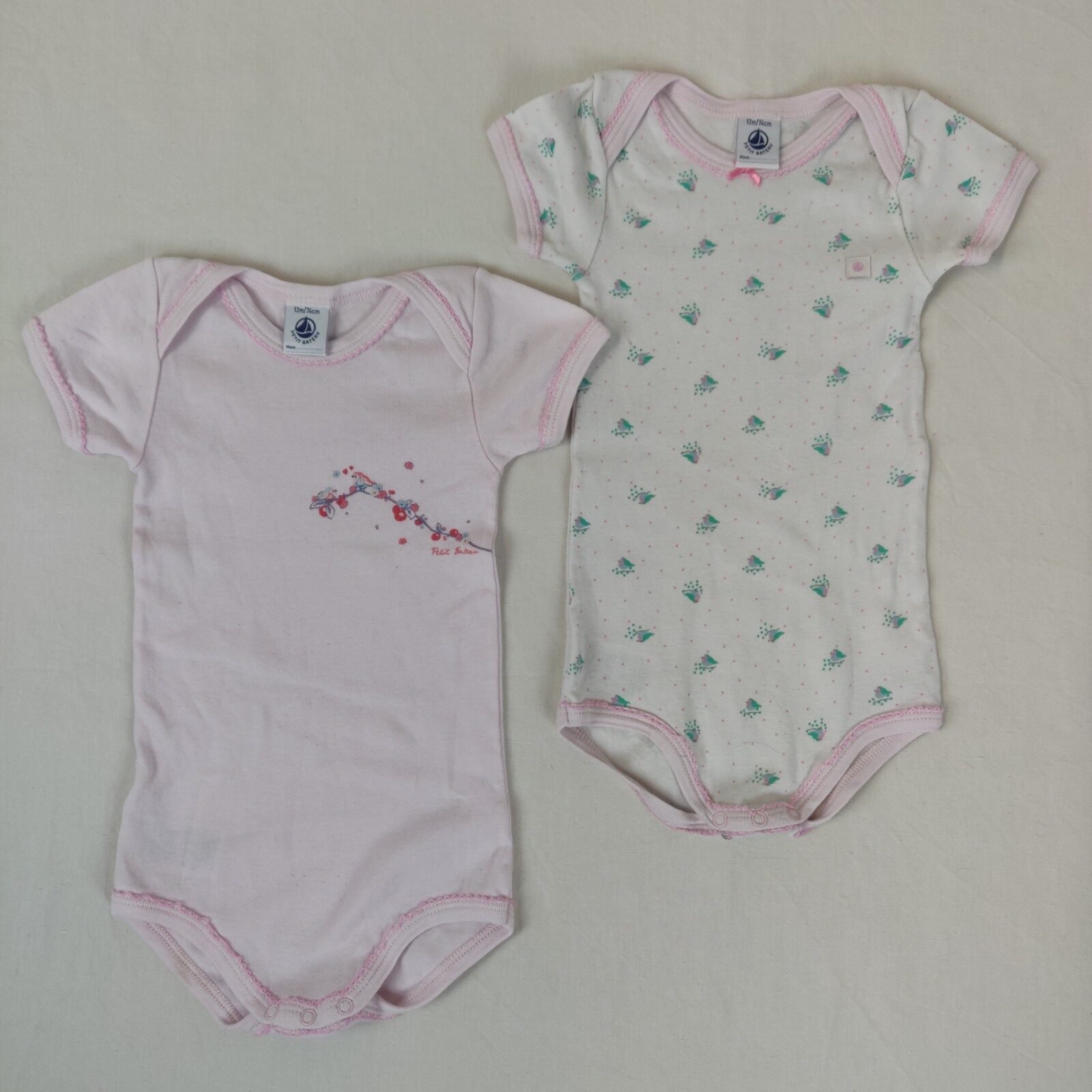 Autres commentaires : Lot de 2 bodies à manches courtes. Un body blanc à pois roses. Motifs petit oiseau vert, rose et bleu sur une branche. Un body rose. Motifs centraux petits oiseaux multicolores sur une branche fleurie.