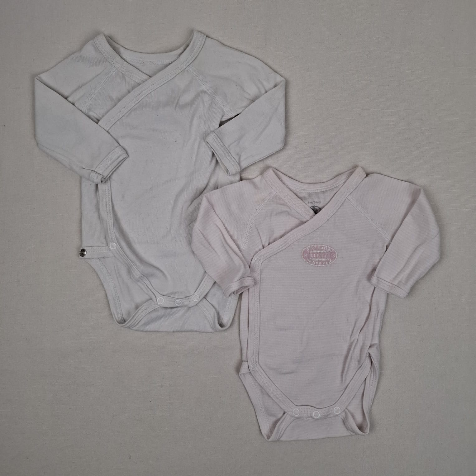 Autres commentaires : Lot de 2 bodys à manches longues: -Blanc. -Blanc à rayures rose clair à motif emblena rose avec inscription « Petit bateau MILLERAIES »