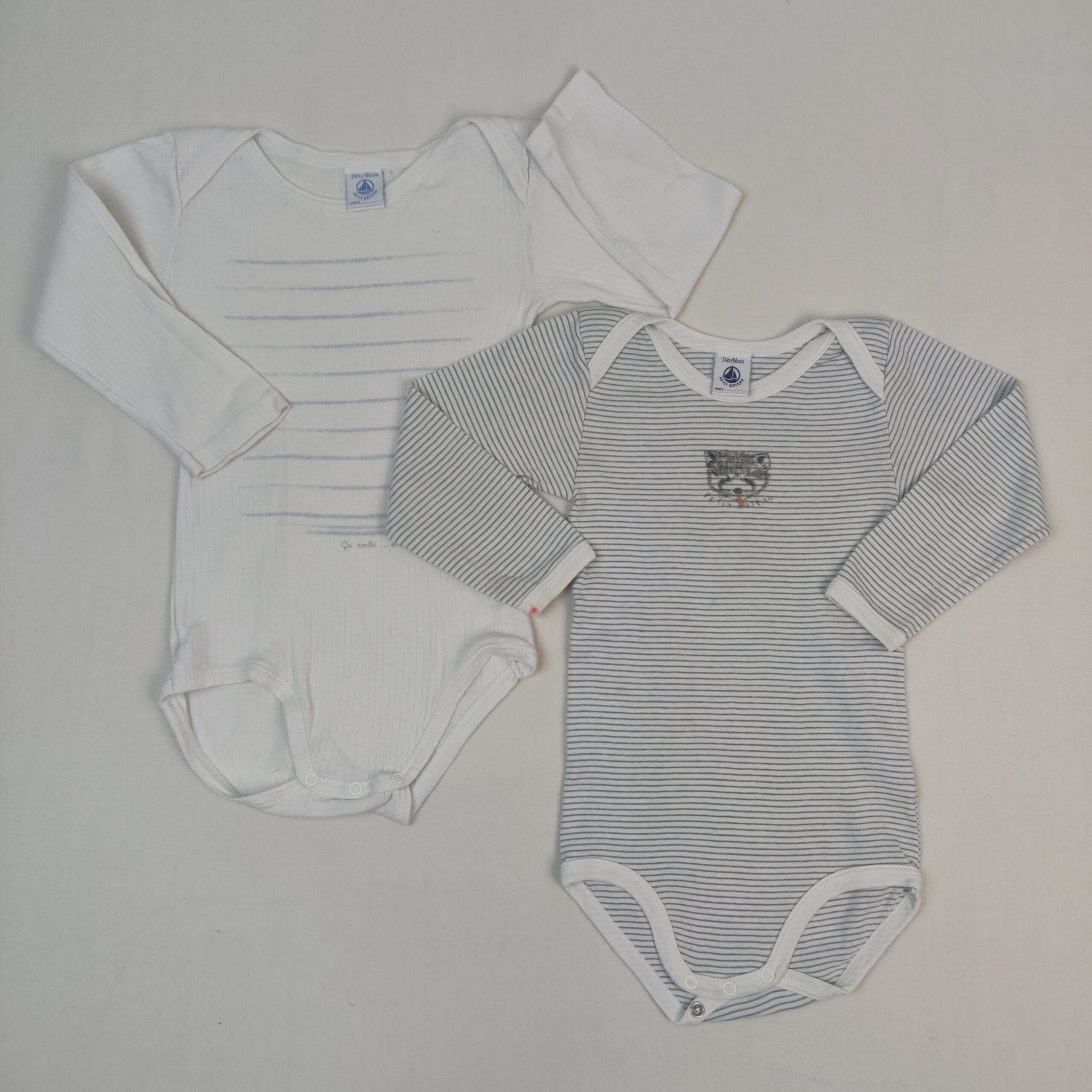 Autres commentaires : Lot de 2 bodies manches longues dont 1 blanc à rayures grises, motif raton laveur, petites taches sur la manche droite et 1 blanc en jersey côtelé avec traces bleu-mauve, motif petit bateau sur roulette avec l’inscription « ça roule …en petit Bateau.