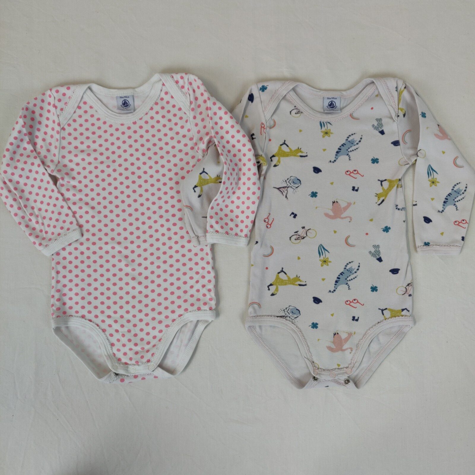 Autres commentaires : Lot de 2 bodies à manches longues. Un body blanc à pois roses. Fine dentelle blanche au niveau du col et des poignets. Un body blanc avec des motifs variés multicolores. Fine dentelle rose au niveau du col et des poignets. Usure normale des bodies.