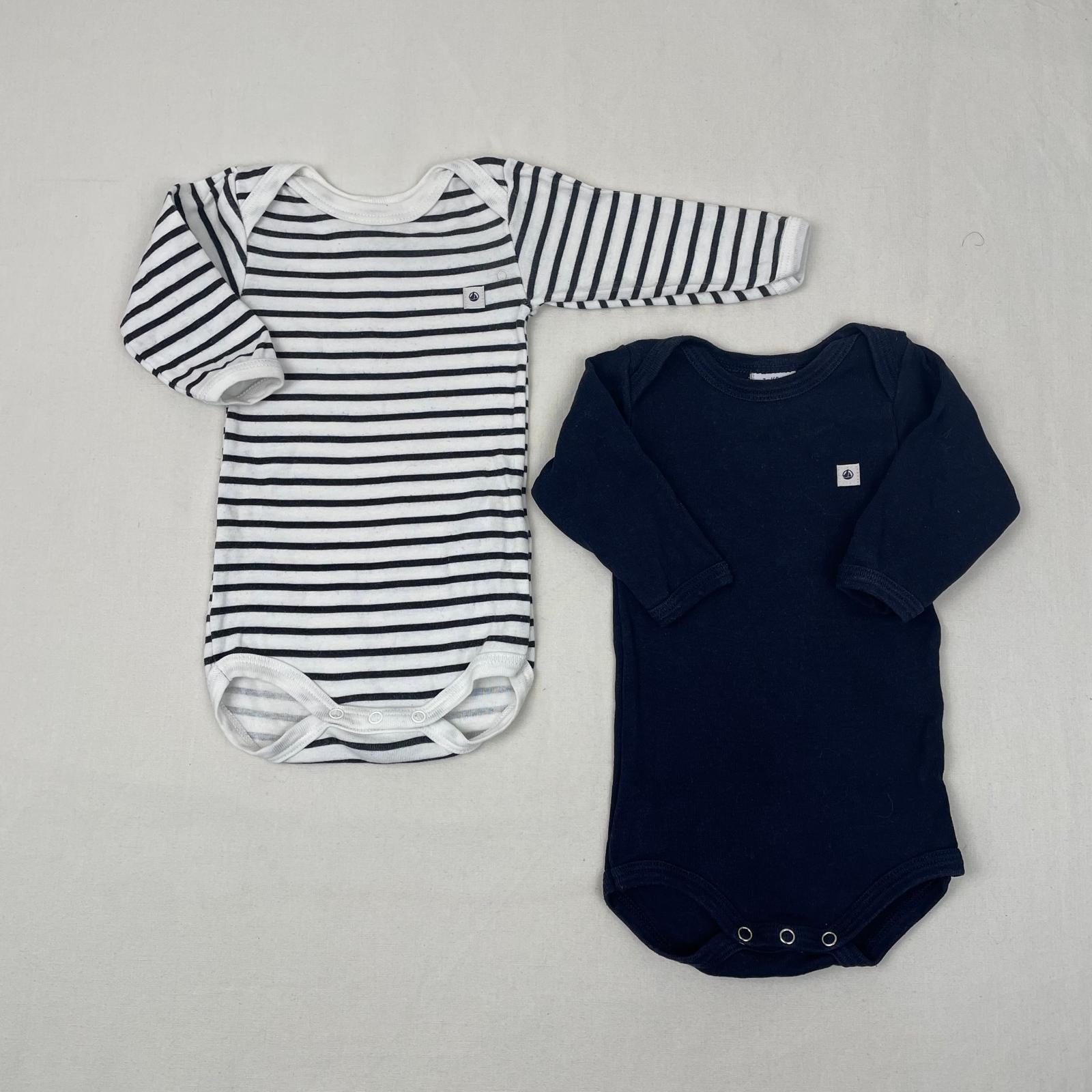 Autres commentaires : 2 bodies, monches longues, fermeture par boutons pression au bas : – body bleu foncé et body blanc à rayures noir.