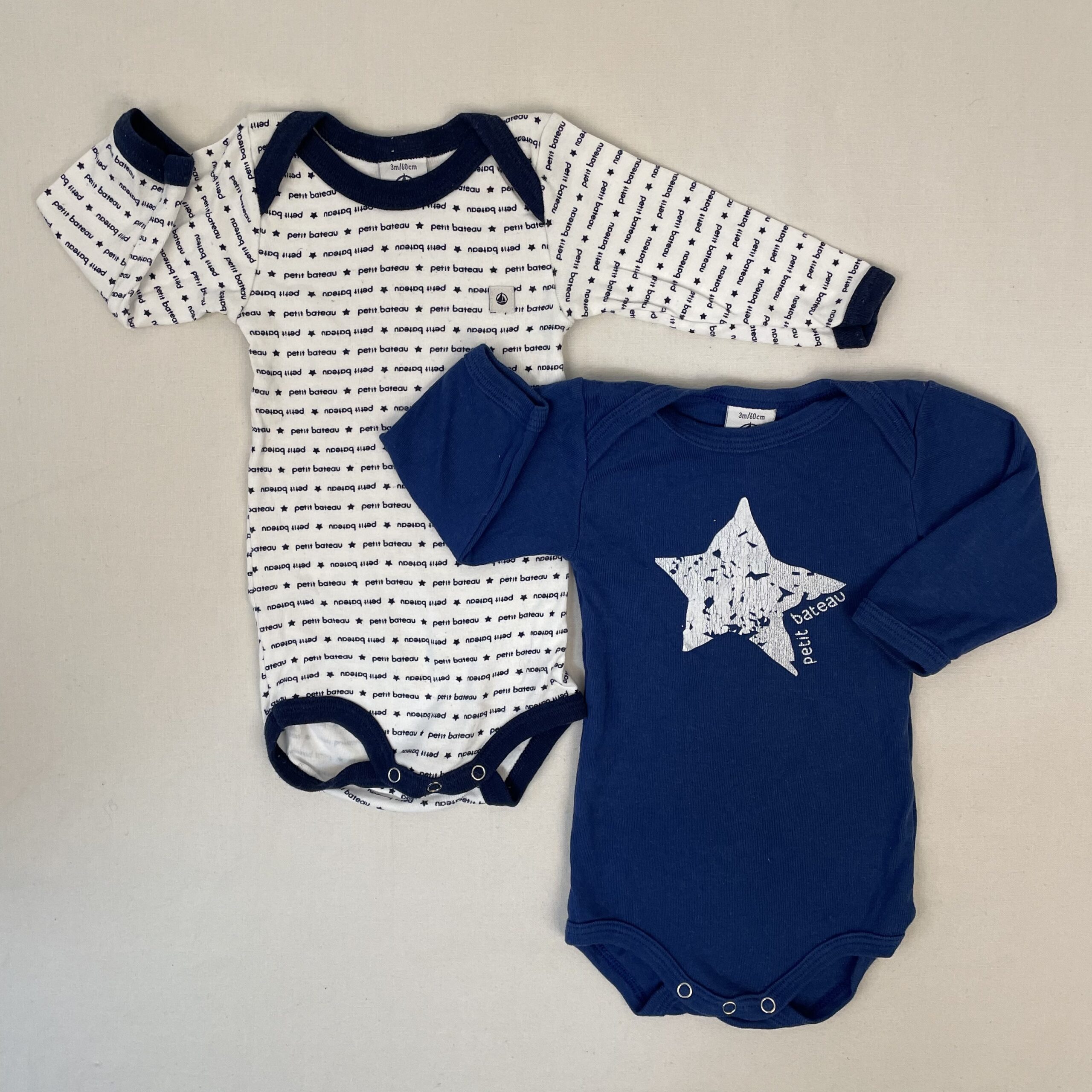 - Lot de 2 bodies manches longues : – un blanc parsemé d’inscriptions « Petit bateau » en bleu marine, bordures bleu marine, en parfait état. – un bleu électrique, devant motif d’étoile blanche un peu craquelée.