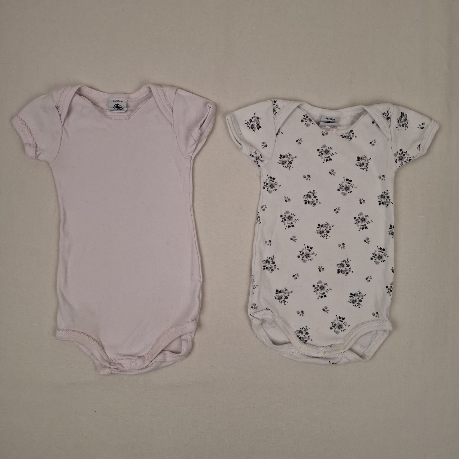 Autres commentaires : Lot de 2 body Petit Bateau, manches courtes, col rond, boutons pression au niveau de l’entrejambe pour ouvrir le body: -Body rose simple. -Body blanc à motifs de fleurs grises, et un petit noeud papillon rose au niveau du col.