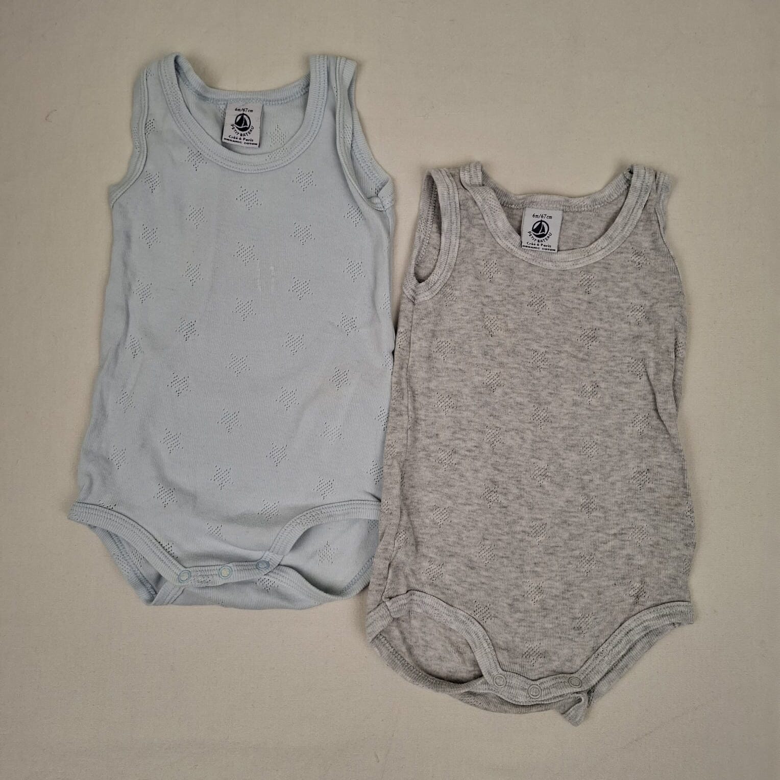 Autres commentaires : Lot de 2 bodies débardeurs, sans manches, parsémés d’étoiles en points ajourés : – Un gris grège. – Un bleu pâle. (deux petits traits fins un peu blanchis sur le devant).