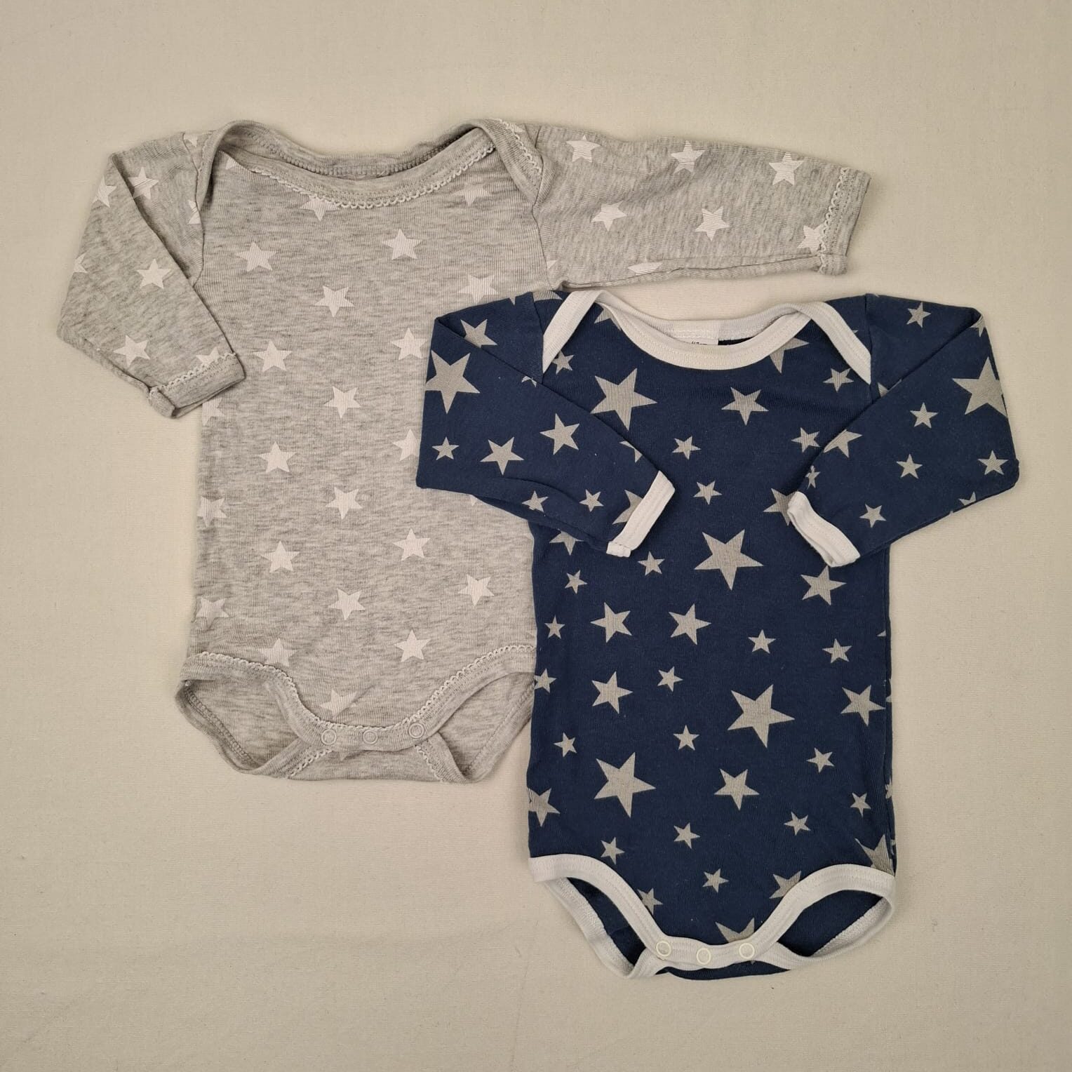 Autres commentaires : Lot de 2 bodys à manches longues, col US: – Un bleu foncé à étoiles beiges. – Un gris à étoiles blanches, sans marque.