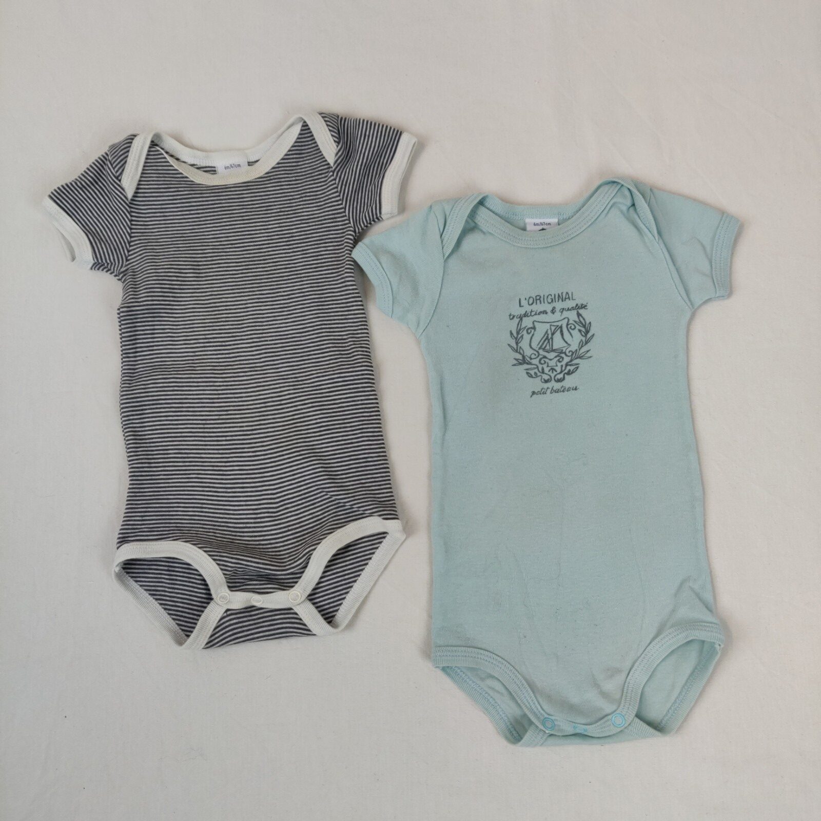 Autres commentaires : Lot de 2 bodies à manches courtes. Un body vert avec motif central voilier noir accompagné de l’inscription « L’original tradition et qualité Petit Bateau ». Legère tâche de décoloration au niveau du col. Un body à motif milleraies blanc et bleu marine. Une tâche marron au niveau du col.