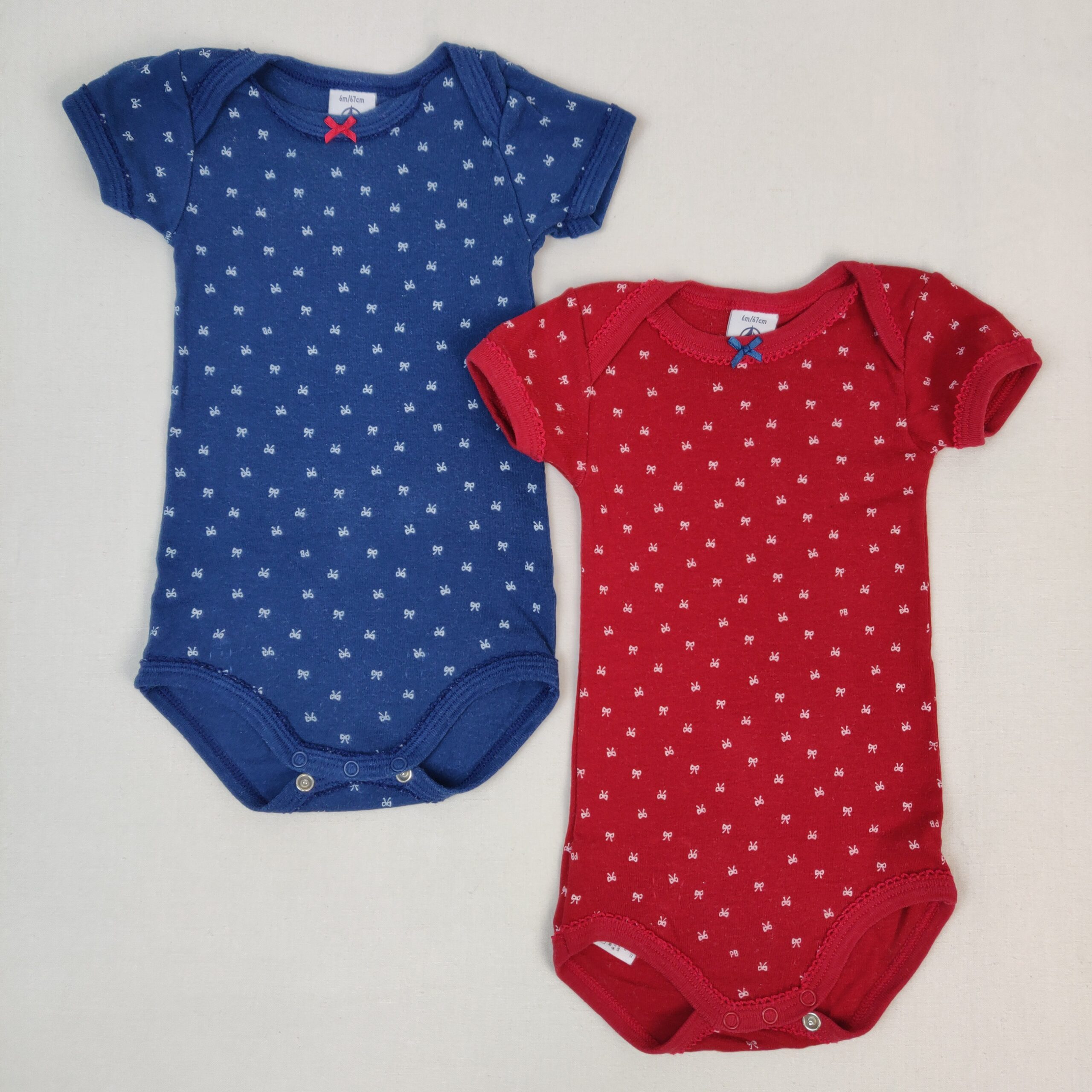 Autres commentaires : Lot de 2 bodies manches courtes : 1 rouge et 1 bleu, motif noeud papillon blanc.
