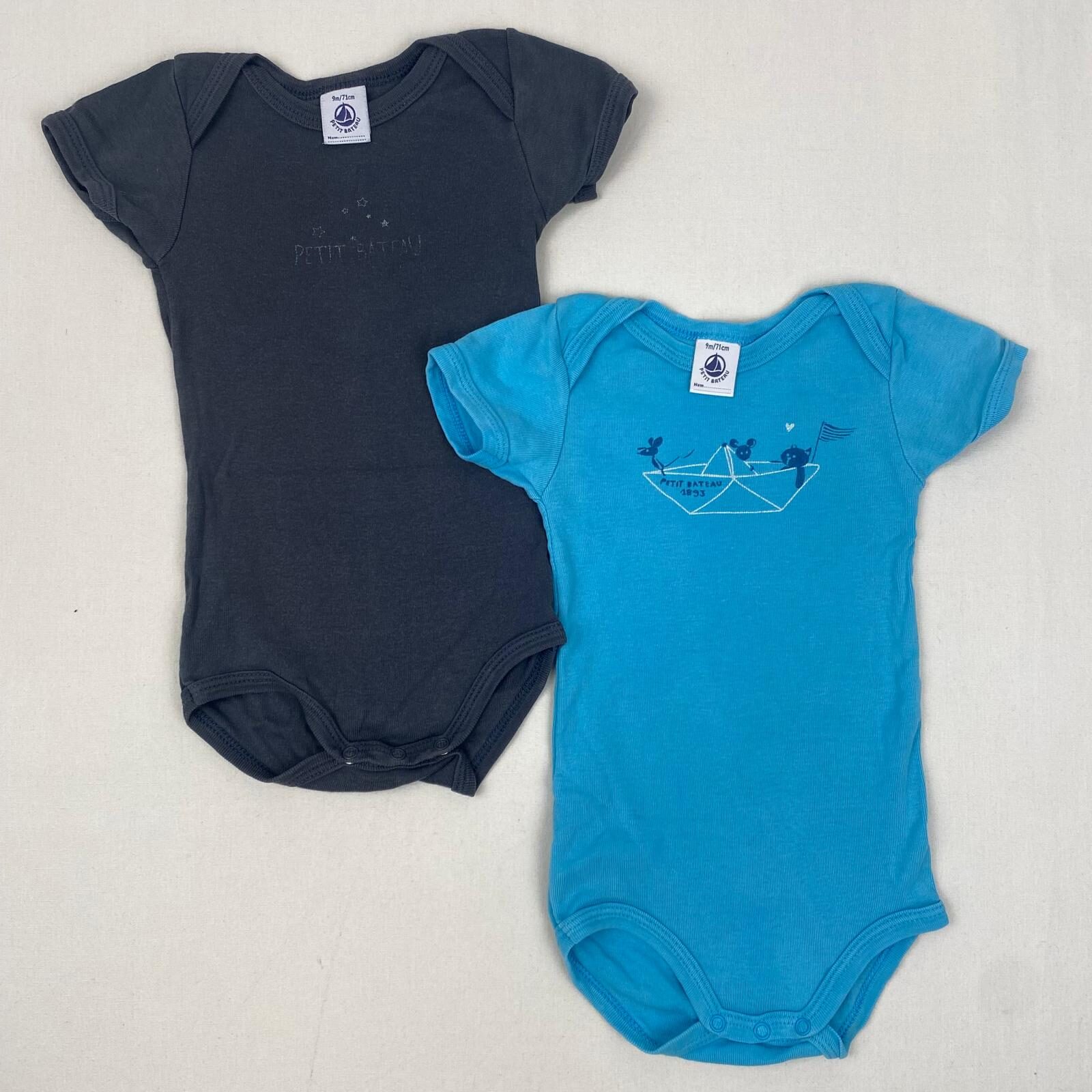 Autres commentaires : Lot de 2 bodys à manches courtes, col US: – Bleu avec motif bateaux en papier. – Gris foncé uni, inscription » Petit bateau ».