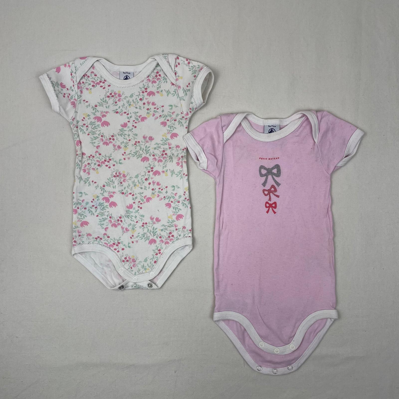 Autres commentaires : Lot de 2 body à manches courtes, col US: – un blanc, motif floral. – un rose clair, motif noeuds.
