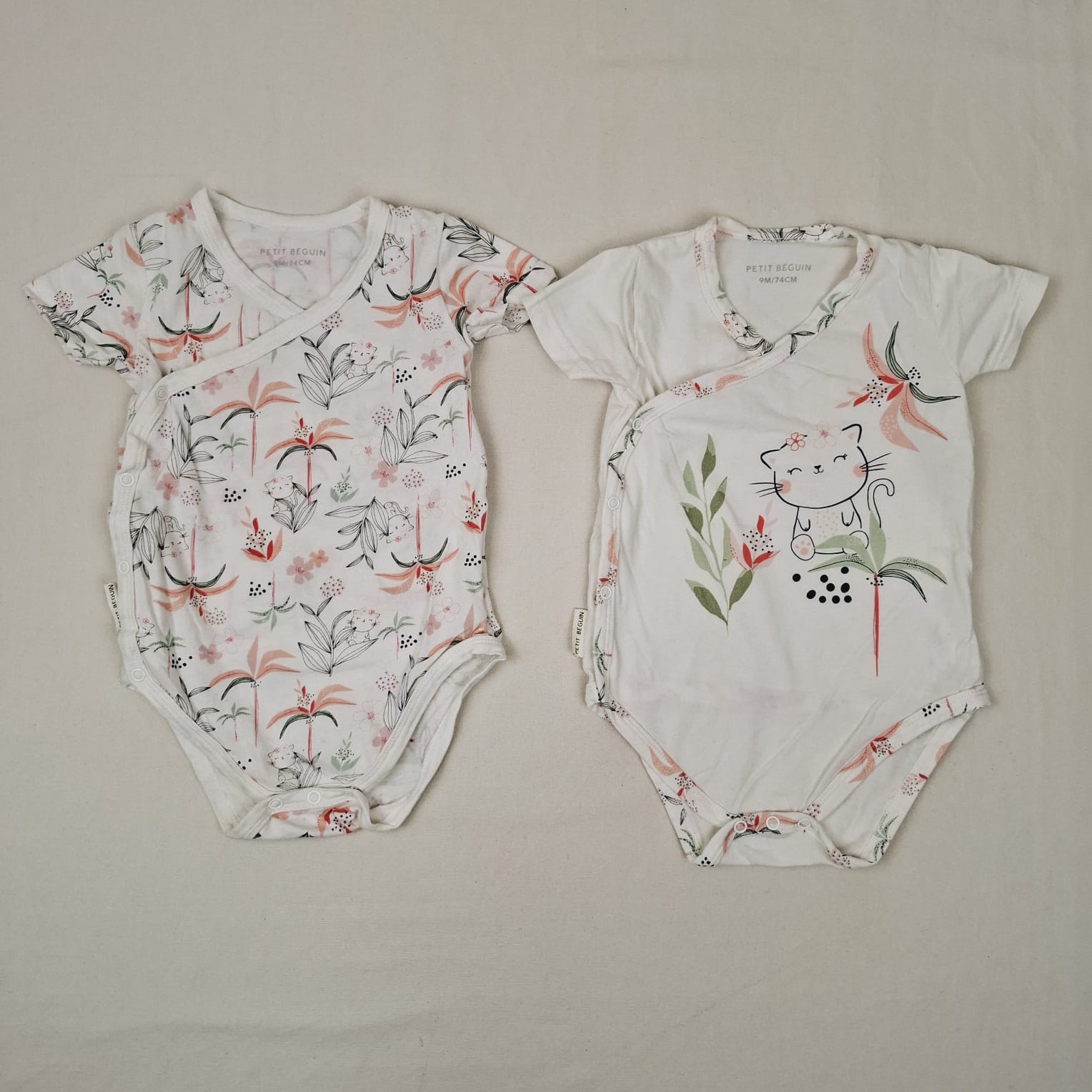 Autres commentaires : Lot de 2 bodies croisés blanc cassé à manches courtes, fermeture par boutons pression devant , à l’intérieur et à l’entrejambe : – un avec motif de chat avec fleurs de style japonais, de couleur bleu nuit, rose et vert tilleul.