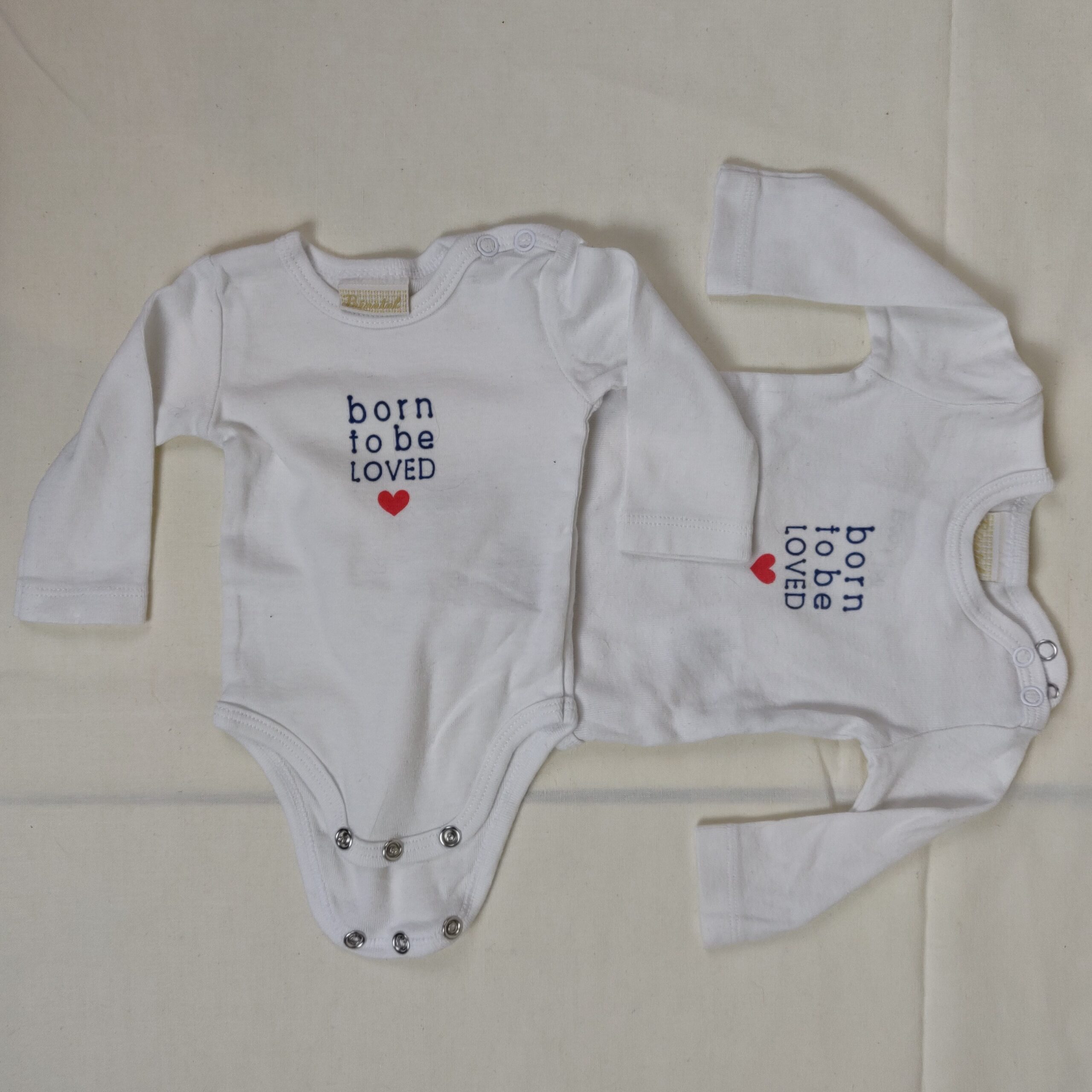 Autres commentaires : Deux bodies manches longues, fermés au cou et à l’entrejambe par boutons pression. Inscription « born to be loved »