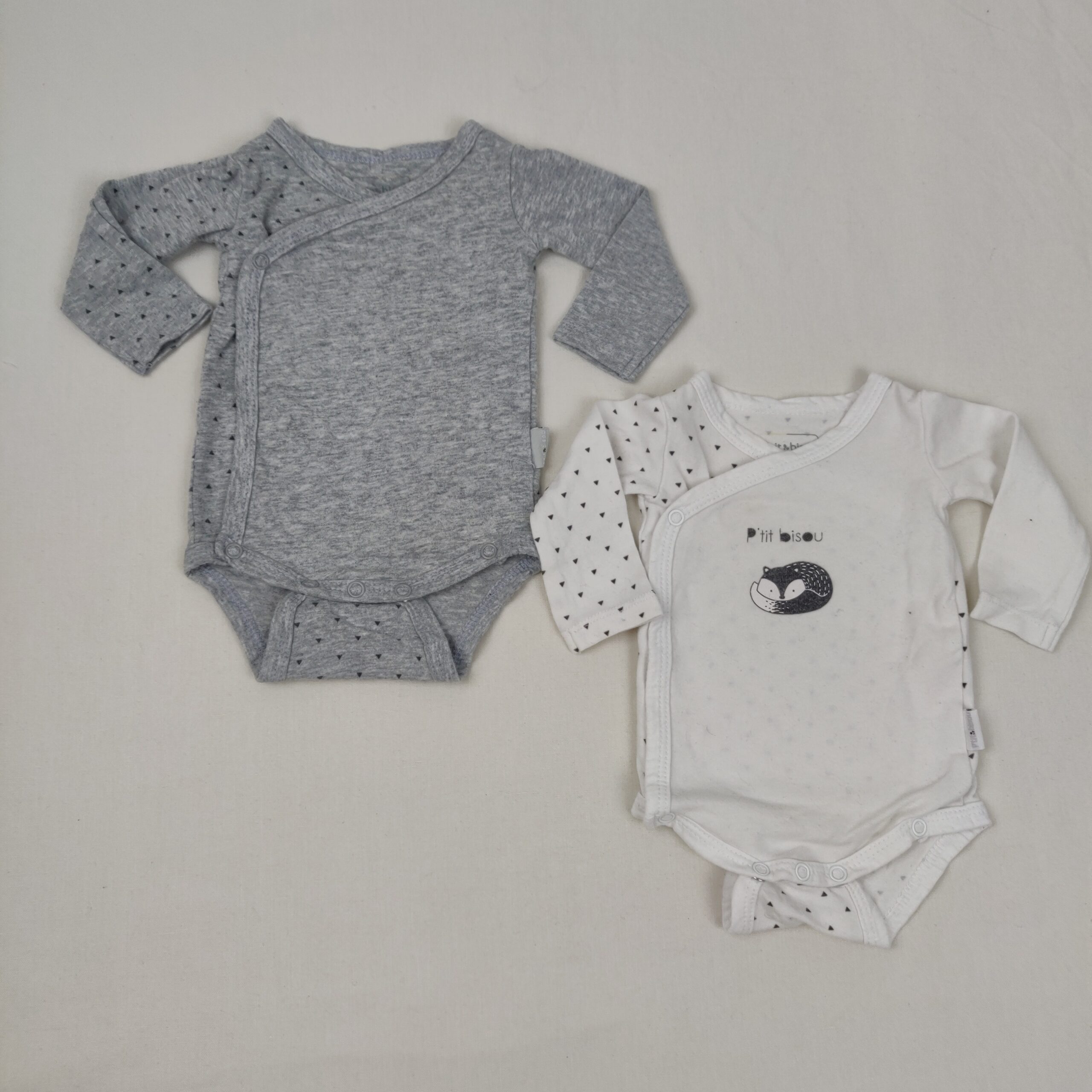 Autres commentaires : Lot de 2 bodies croisés assortis manches longues – un blanc avec motifs renard noir et blanc et mini triangles noirs et un de couleur grise avec motifs mini triangles noirs.