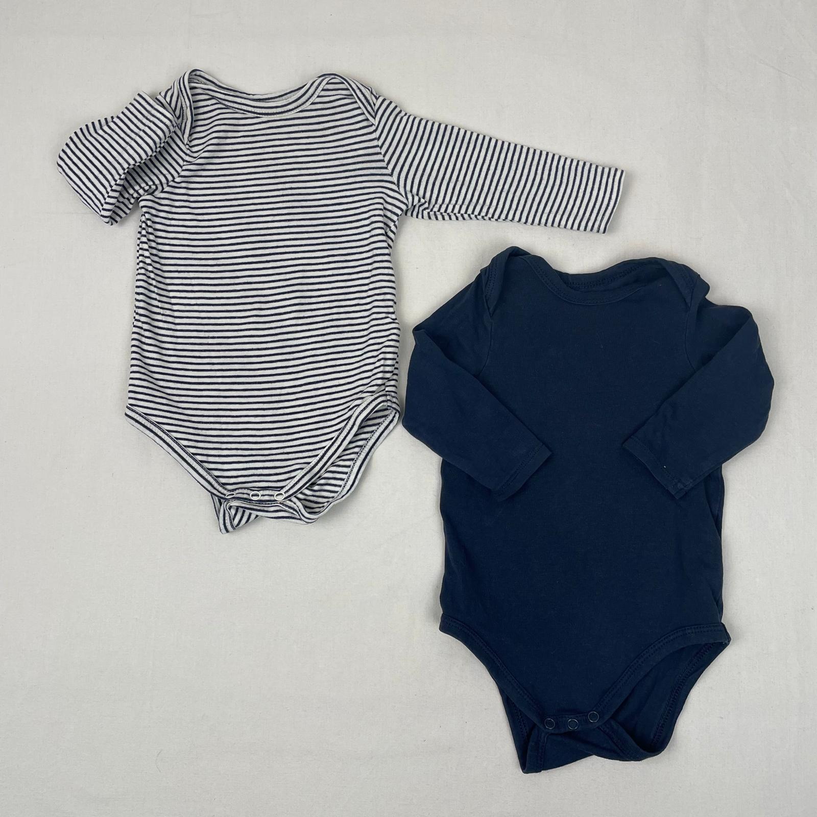Autres commentaires : 2 bodies, monches longues, fermeture par boutons pression au bas : – body bleu foncé et body blabc à rayures bleu foncé.