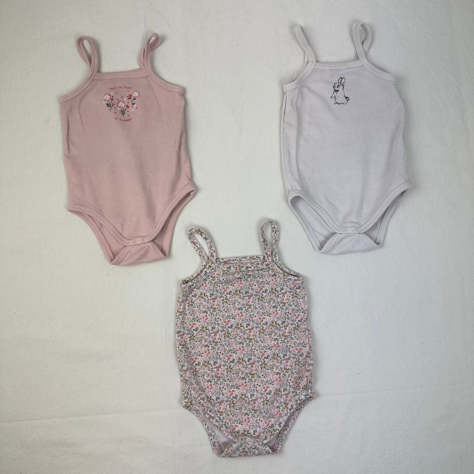 Autres commentaires : 2 bodies avec manches en bretelles et un body blanc avec petites tâches offerts.