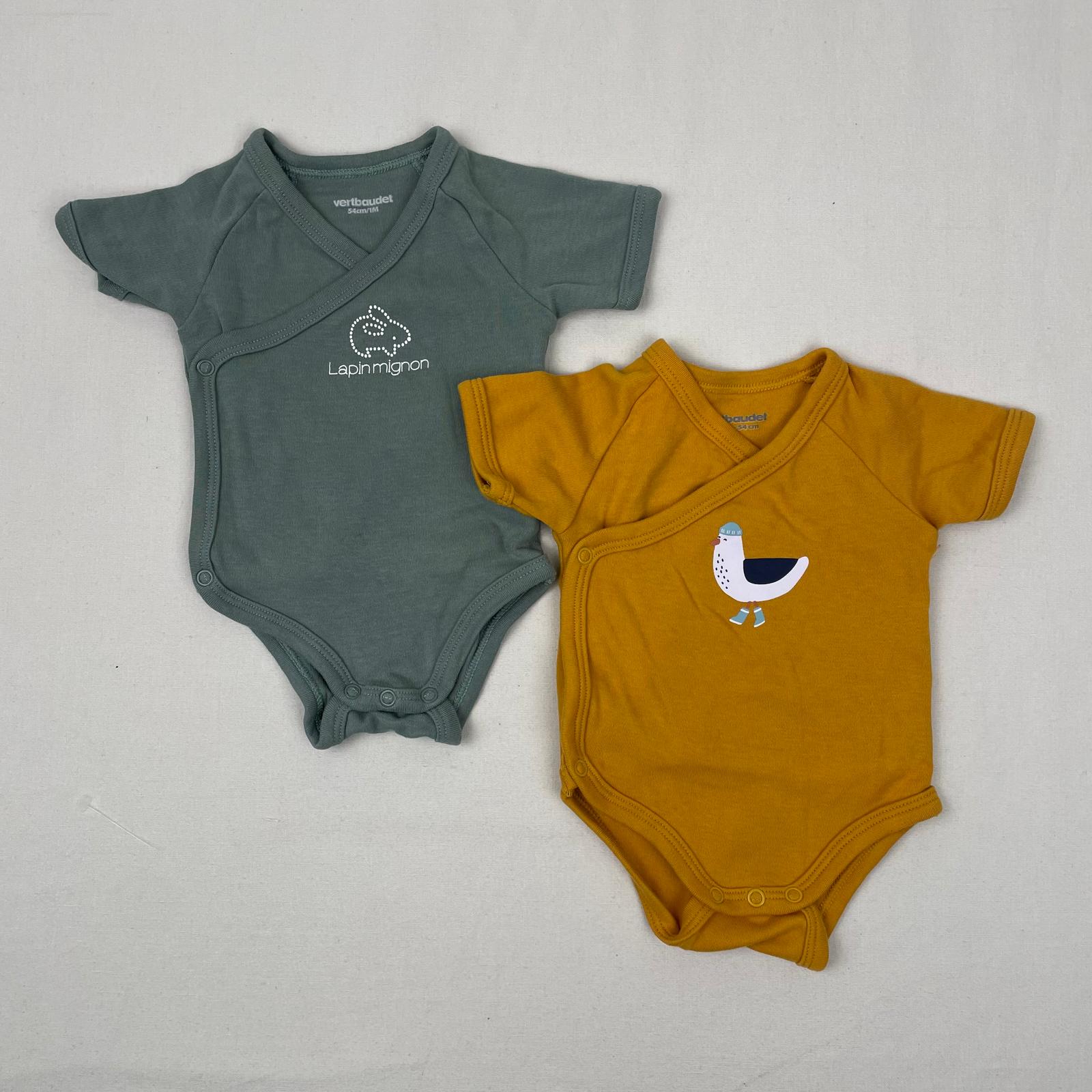 Autres commentaires : Lot de 2 bodys croisé à manches courtes: – un jaune moutarde avec un motif de mouette. – un gris-vert uni avec motif lapin et inscription « Lapin mignon ».
