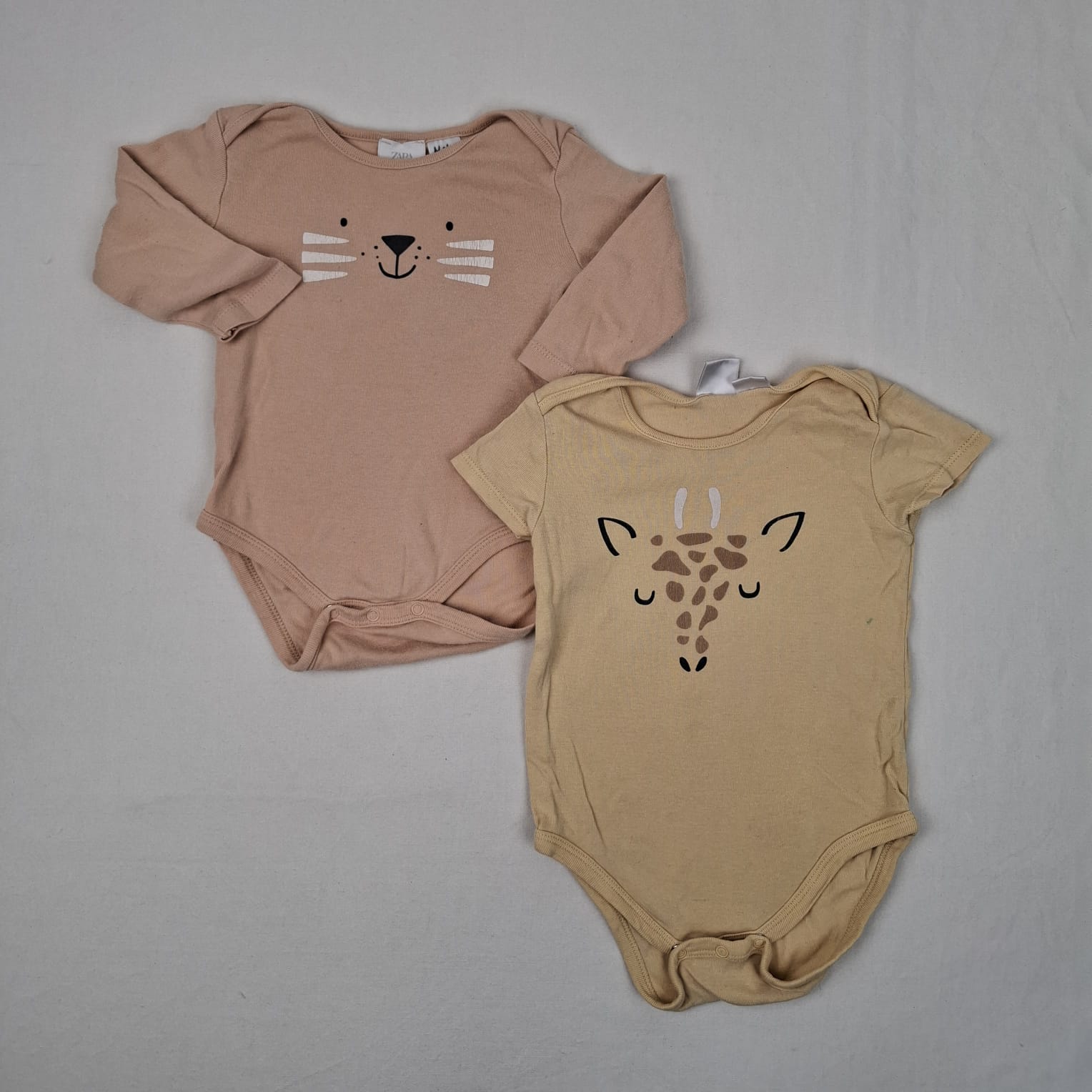 Autres commentaires : Lot de 2 body, Zara, col rond, boutons pression au niveau de l’entrejambe: -Body jaune, manches courtes, avec une tête de giraffe floqué à l’avant. -Body rose, manches longues, avec une tête de chat floqué à l’avant.